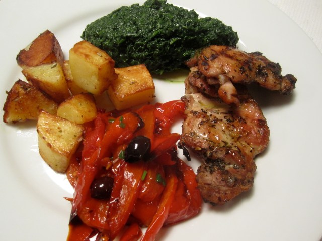 To accompany the smokey chicken, we’re having a wonderful sweet roasted pepperonata–a red pepper and tomato stew that I’ve roasted instead of simmered in a pot (the traditional way) and to which I’ve added black olives. Roasting the peppers and tomatoes concentrates their flavors and sweetness and adding the olives gives them just the right balance of sweet and salty. In addition, I’ve made pureed spinach and skillet potatoes with the duck fat leftover from my deconstructed duck post.