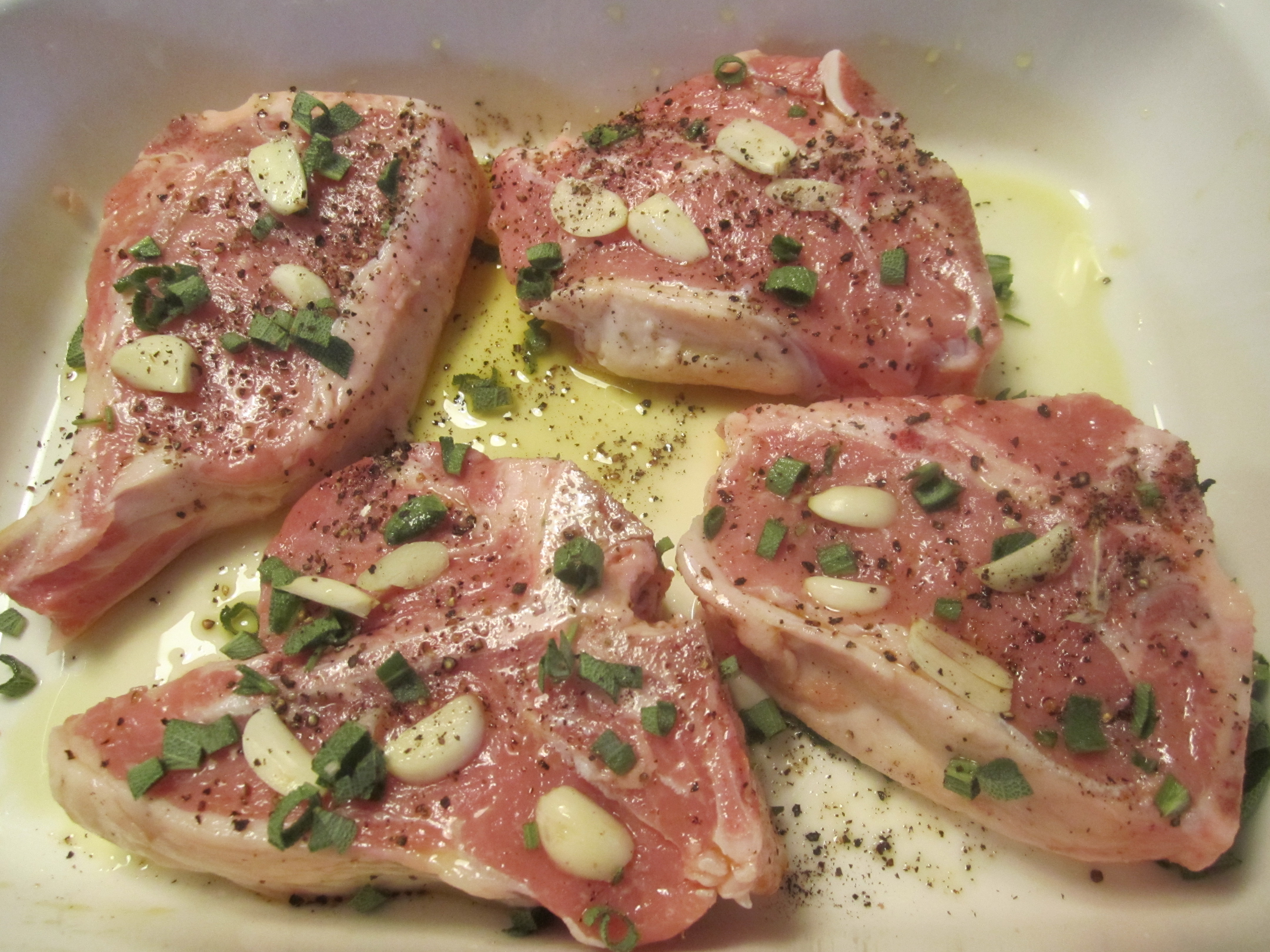I always like to rub the chops with a bit of sage, garlic, olive oil and lots of black pepper. This rub can be done several hours ahead. No salt goes on until just prior to grilling–this meat is too delicate for advanced salting.