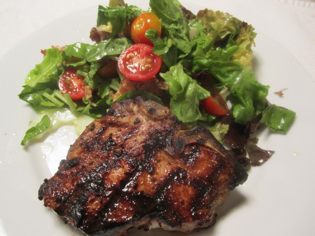 Once the grill is hot, the chops get seared for about 2 minutes per side (these are about 1 – 1/2″ thick), then moved to a less hot area of the grill for about 4 minutes. The internal temperature should be around 120 – 130 degrees as soon as the meat comes off the grill. The chops should be allowed to rest for about 5 minutes prior to serving.