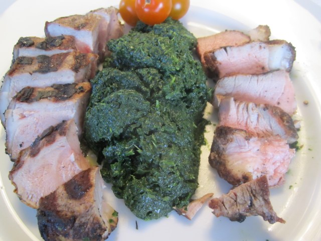 I’ve chosen to serve my chops off the bone and sliced steakhouse-style with the perfect accompaniment of pureed spinach. They could also be served on the bone with a salad (one of my guests doesn’t like pureed spinach and doesn’t like the bone removed).