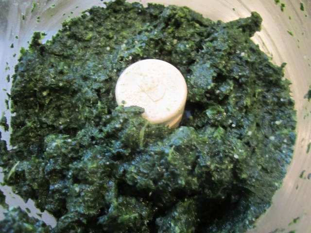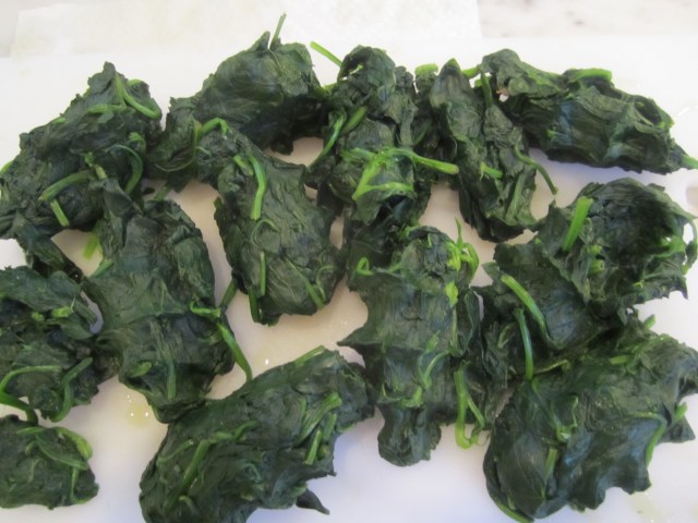 Blanch spinach in heavily salted water for about a minute (work in batches so as not to overcrowd the pot or else it will take the water too long to return to the boil, resulting in overcooked spinach). Shock each back in cold water as it comes out of the boiling water. In small bundles, squeeze the spinach well and set aside.