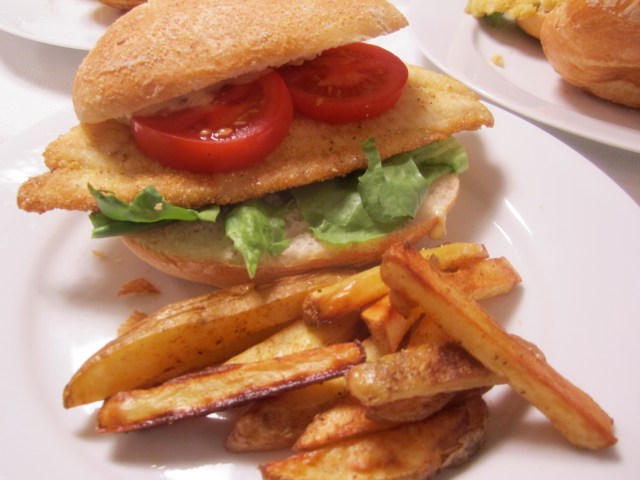 After a perfect day at the beach, sometimes all I want is a crispy fried fish sandwich–American style. Flounder is local in Eastern Long Island and it’s sweet and delicate. Because the filets are generally thin, they’re very prone to overcooking. That’s why some sort of coating is a good idea–either bread crumbs or cornmeal. I find cornmeal works great as a simple coating for fish. I add a bit of flour (about one part flour to two parts cornmeal) so that the coating adheres well to the fish.