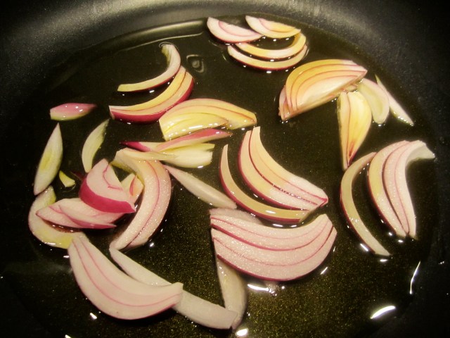 In a broad skillet, with a couple of tablespoons of olive oil, saute some coarsely sliced onions until lightly golden.
