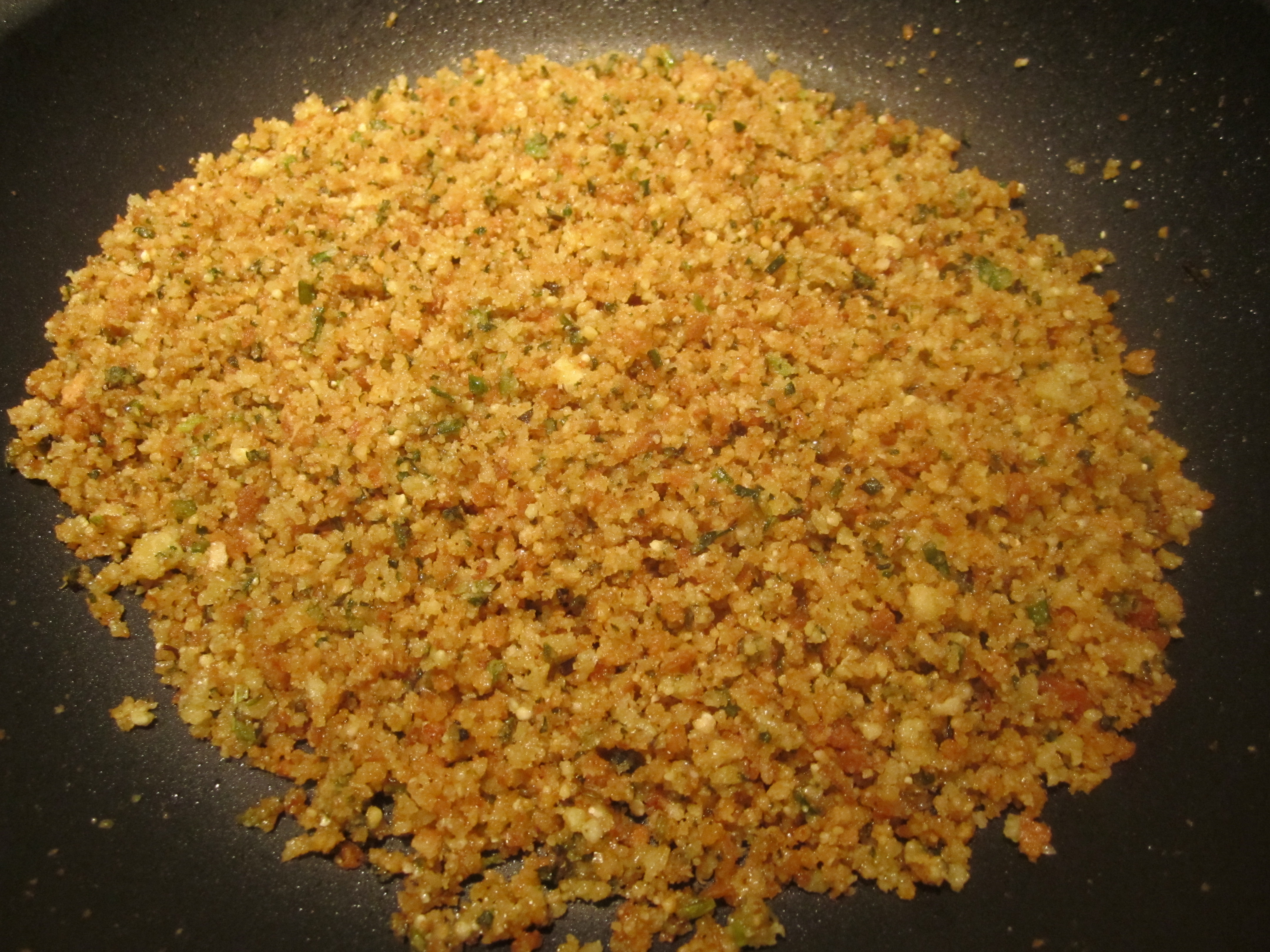 I’ve made my own seasoned crumbs tonight with odd pieces of stale bread that I keep for months on end, leaving them to dry on a tray in the oven when it’s turned off. In addition, I’ve added chopped parsley, nutmeg, chives and pecorino cheese. Then I’ve toasted them in a skillet with olive oil until they turn golden–the aroma alone is worth the trouble!
