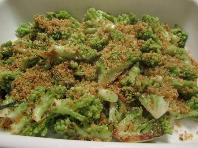 Tonight I want to finish these vegetables with a little crunch, so I’m toasting some seasoned breadcrumbs and sprinkling them on top right before serving. This is a brilliant way to add crispness to any number of dishes. My mother toasts breadcrumbs and garlic and tops cavatelli with them. In fact, there are several pasta dishes in Italy that are finished with toasted breadcrumbs instead of grated cheese (because of the stringent rules of when and when not to use grated cheese in Italy).