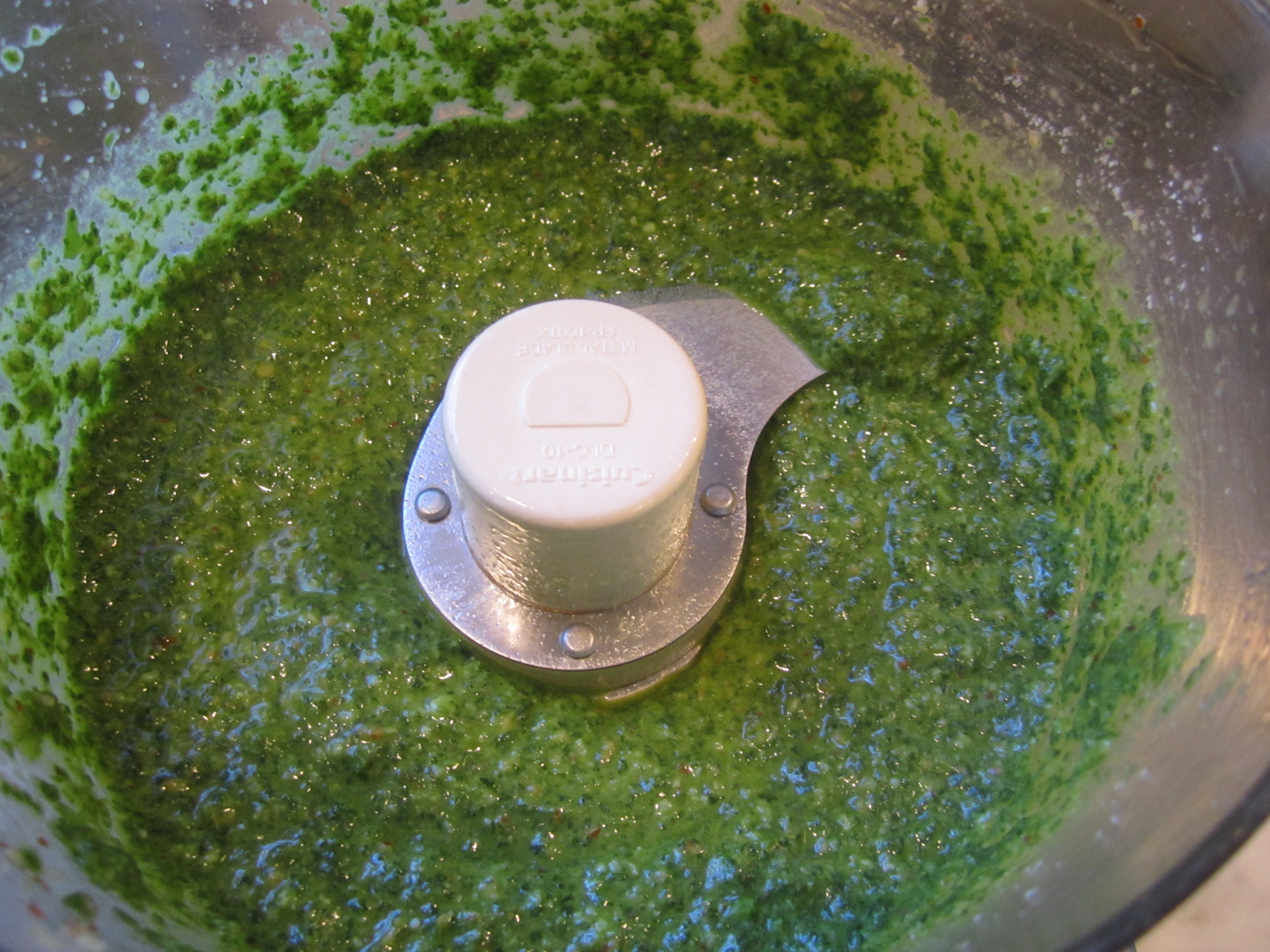 The beauty of this pesto is that it doesn’t discolor like traditional basil pesto. I’ve made prior variations of this sauce before, but tonight’s version is the perfect proportion of ingredients to complement the plain sauteed zucchini.