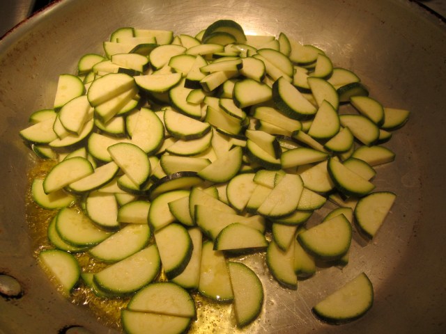 Boil pasta in plenty of salted water. While pasta is boiling, in a broad skillet on highest heat, saute zucchini in oil until just tender (about 6 minutes).