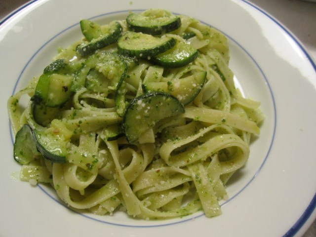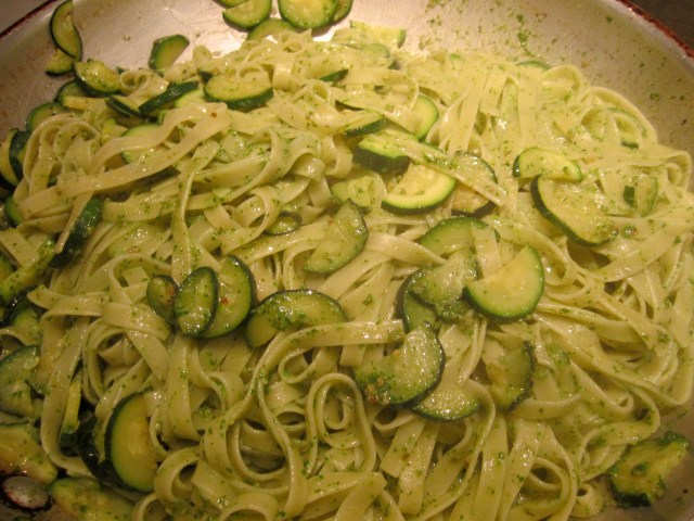 When pasta is about 30 seconds shy of done, toss into skillet with zucchini, along with butter, and a half-cup of pasta cooking water. Turn off heat under skillet and mix in pesto. A bit of pasta water may still be added if mixture is too tight–the pasta will absorb the liquid as it sits.