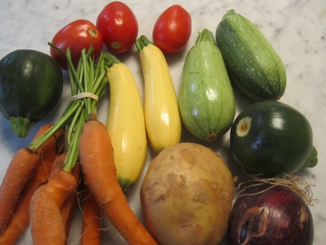 On a wet and rainy Sunday, even in summer, a bowl of soup always satisfies. A minestrone that makes full use of summer squashes and tomatoes is quick and easy to make and a great vehicle for a dollop of basil pesto, should you have any to use up from the fridge or freezer.