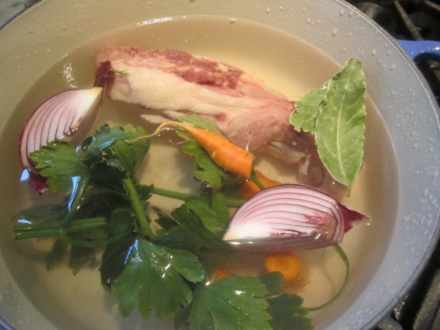 This soup can either be made using water or chicken broth. I happen to have a bag of chicken backs and necks in the freezer, so I’m going to improvise a little chicken stock with some carrots, onion and celery plus a bay leaf, which I’ll simmer for an hour prior to proceeding with the recipe.