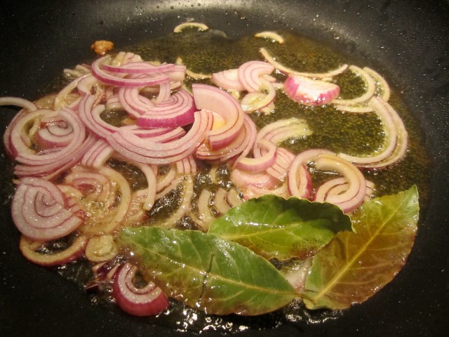 In the same skillet, add onions and bay leaves and lower the heat. Saute onions until slightly caramelized (about 8 – 10 minutes). Turn up heat and add white wine.