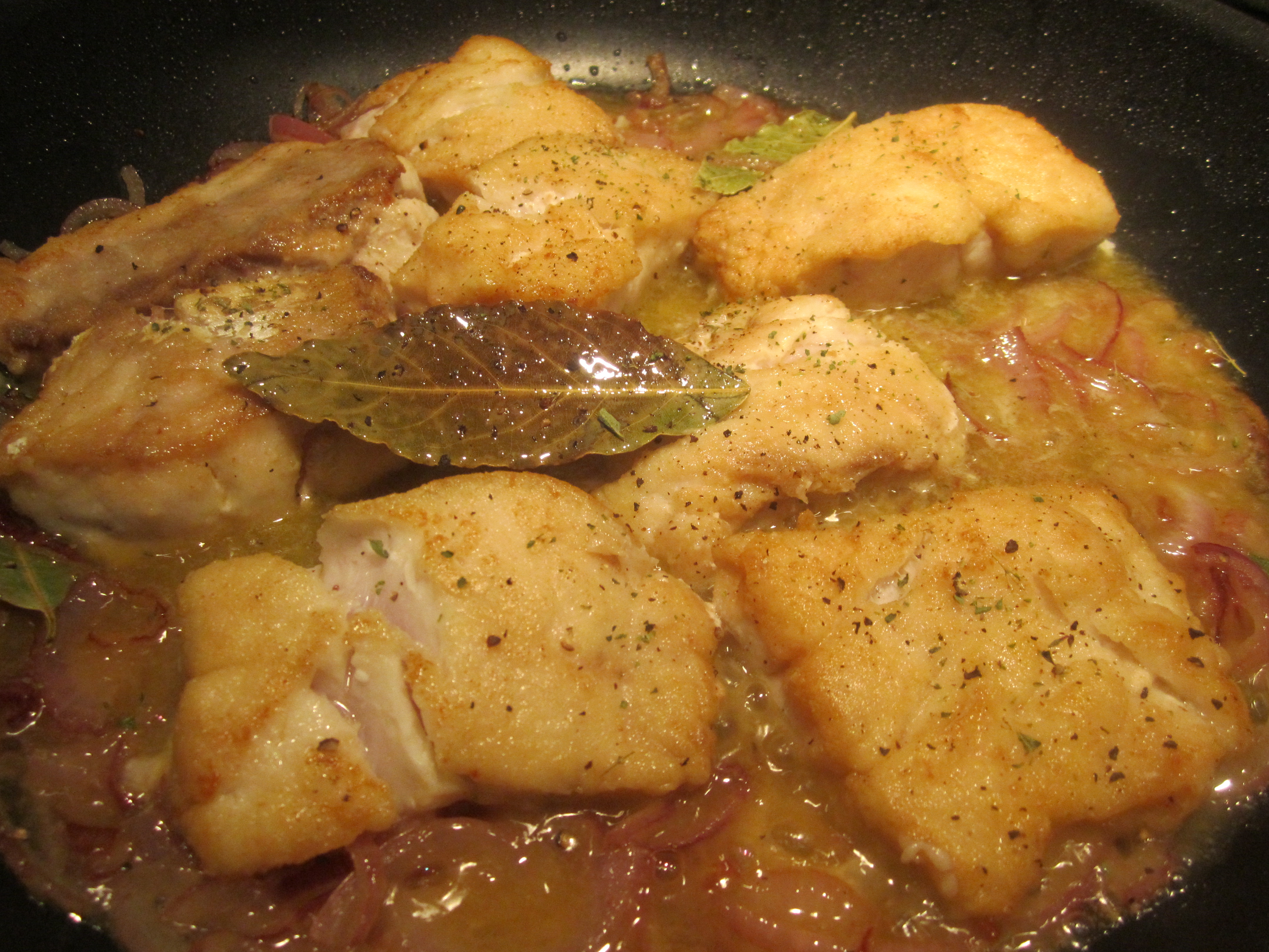 The method of preparation would involve making a simple sauce with sauteed onions, bay leaves, oregano and white wine, then slipping the fish in the sauce and allowing the whole mixture to simmer until cooked. I decided to add one step to the process–dredging the fish in flour and pan-frying prior to making the sauce. The bits of flour clinging to the pan would provide a bit of body for the sauce (to be made in the same skillet as the fish). My mom had no problem with the additional step, so I proceeded with my version of the recipe.