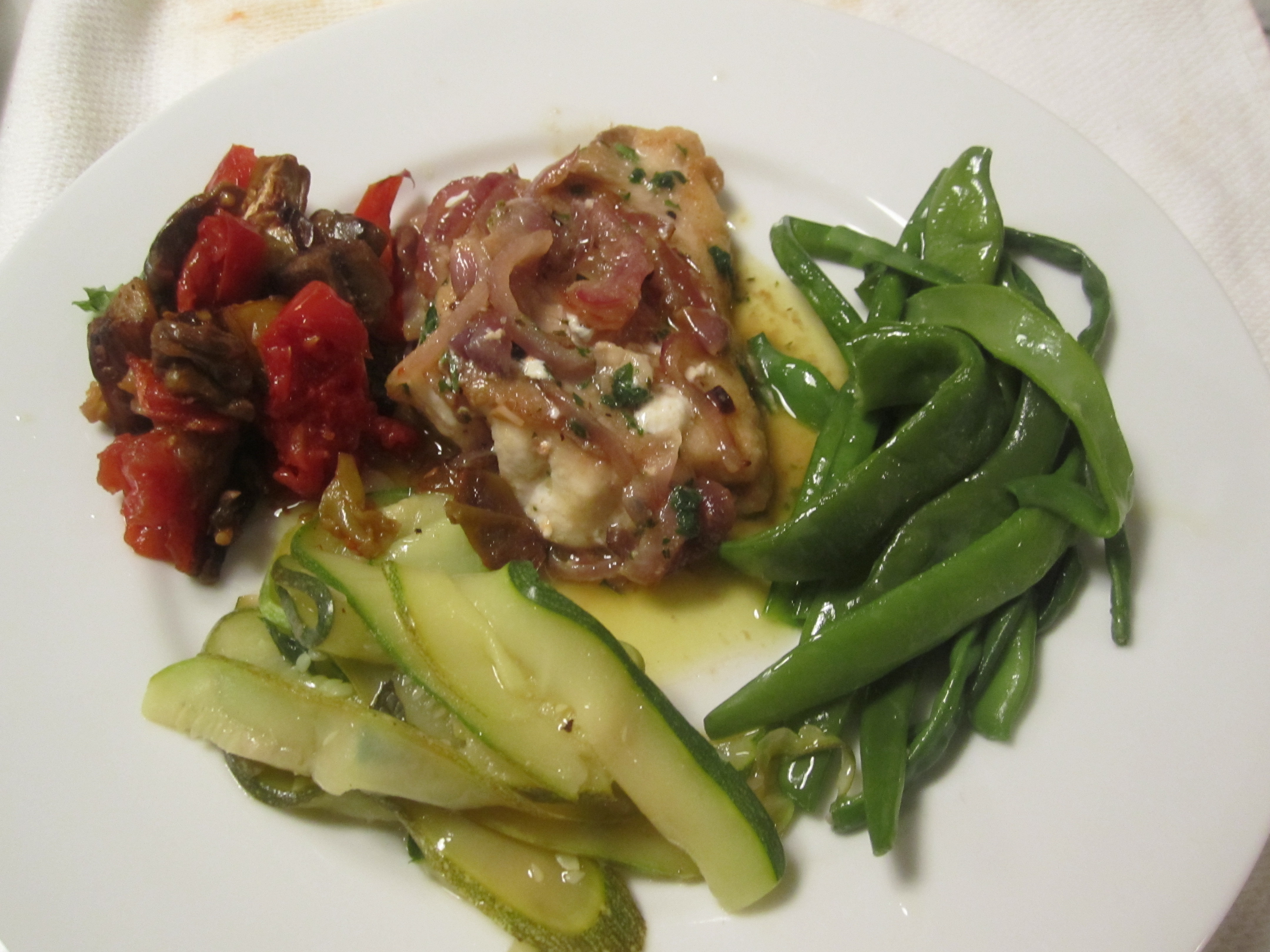 Along with the fish, we made another of my mother’s childhood favorites: zucchini and mint salad. Along with the salad, we had some simple boiled green beans from Beppi’s garden and roasted eggplant, peppers and tomatoes.