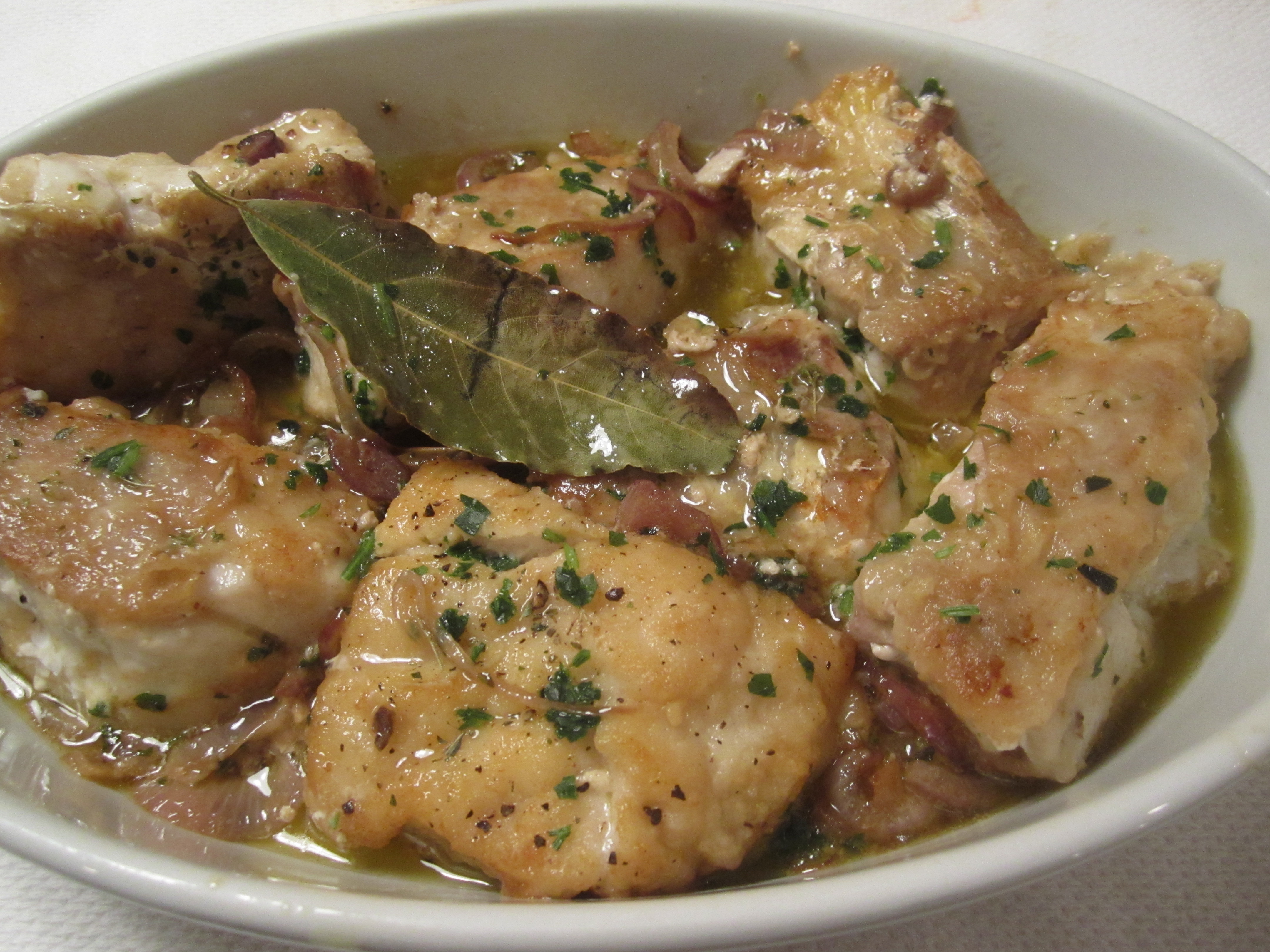 Since my mother is visiting this week, I thought I’d look to her for a cooking method. She told me there were only three cooking methods which her mother used for fish–either fried, in tomato sauce, or “in umido.” The last method involved white wine, onions, oregano and bay leaves. Since she just got back from a month in Calabria, mom had brought back a cache of bay leaves and oregano, freshly dried. This was the perfect chance to take advantage of them.