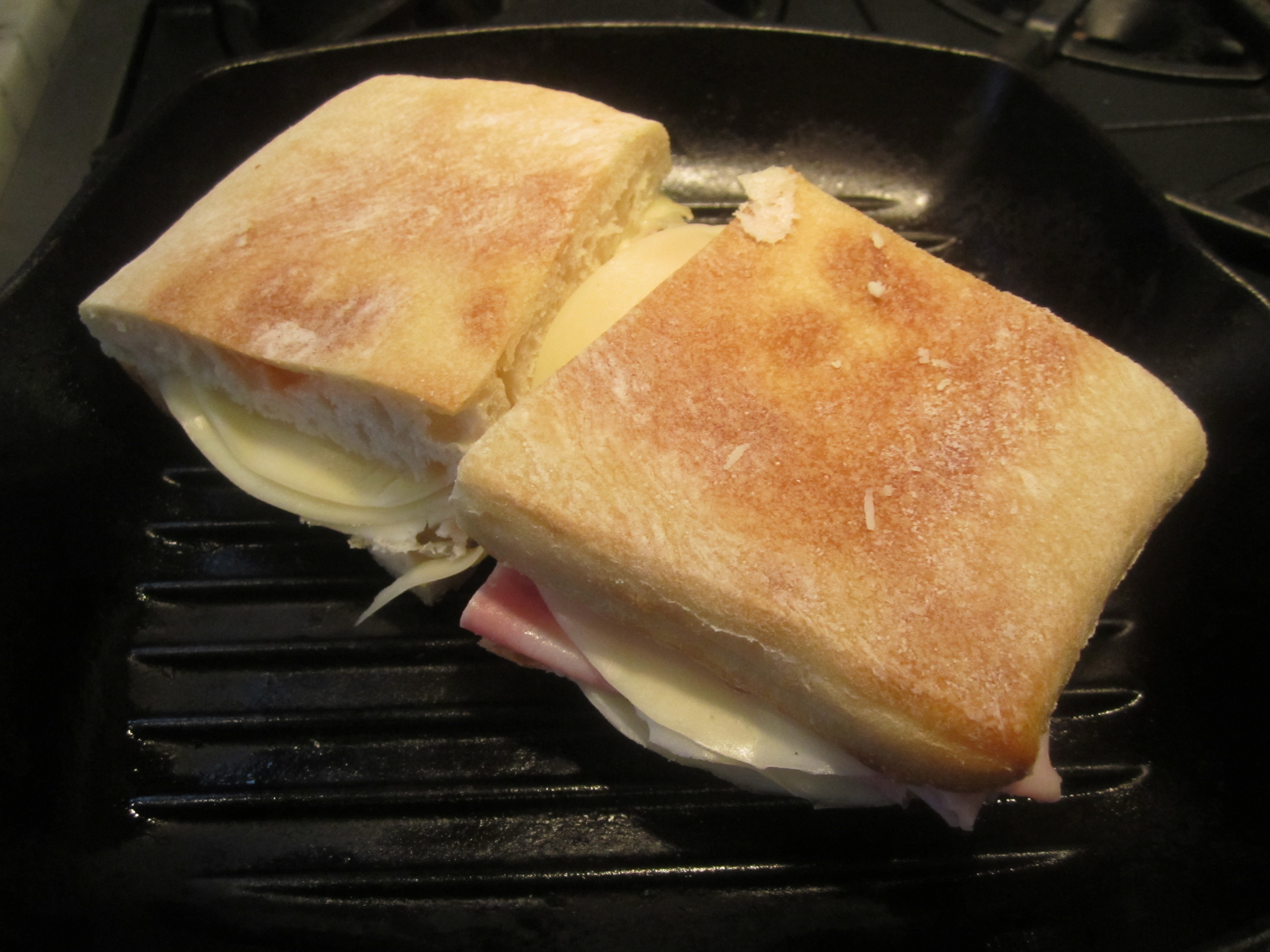 This is so simple, no recipe is required. Nor is any electric panini maker required. A stovetop griddle will suffice (or a simple saute pan if you don’t have a griddle). A lid with some cans on it will act as a weight to press the sandwich into melting submission!
