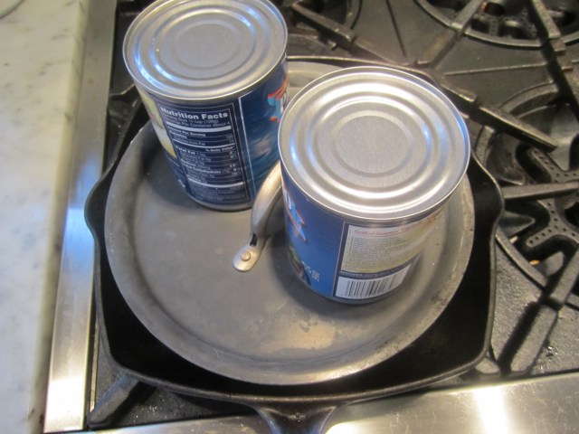 Place a flat lid or baking pan on top, weighted down with 2 cans (beans).