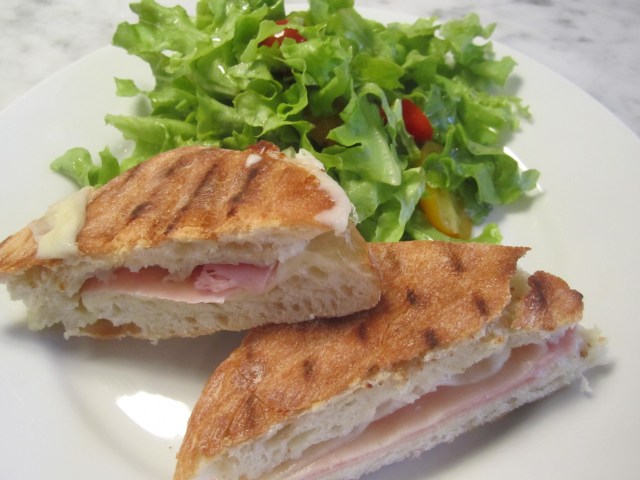 A gooey melting panini is the perfect afternoon snack. I had thinly-sliced ham and provolone left over from making my melanzane ripieno the other day and I just bought a fresh loaf of ciabatta at my local market.