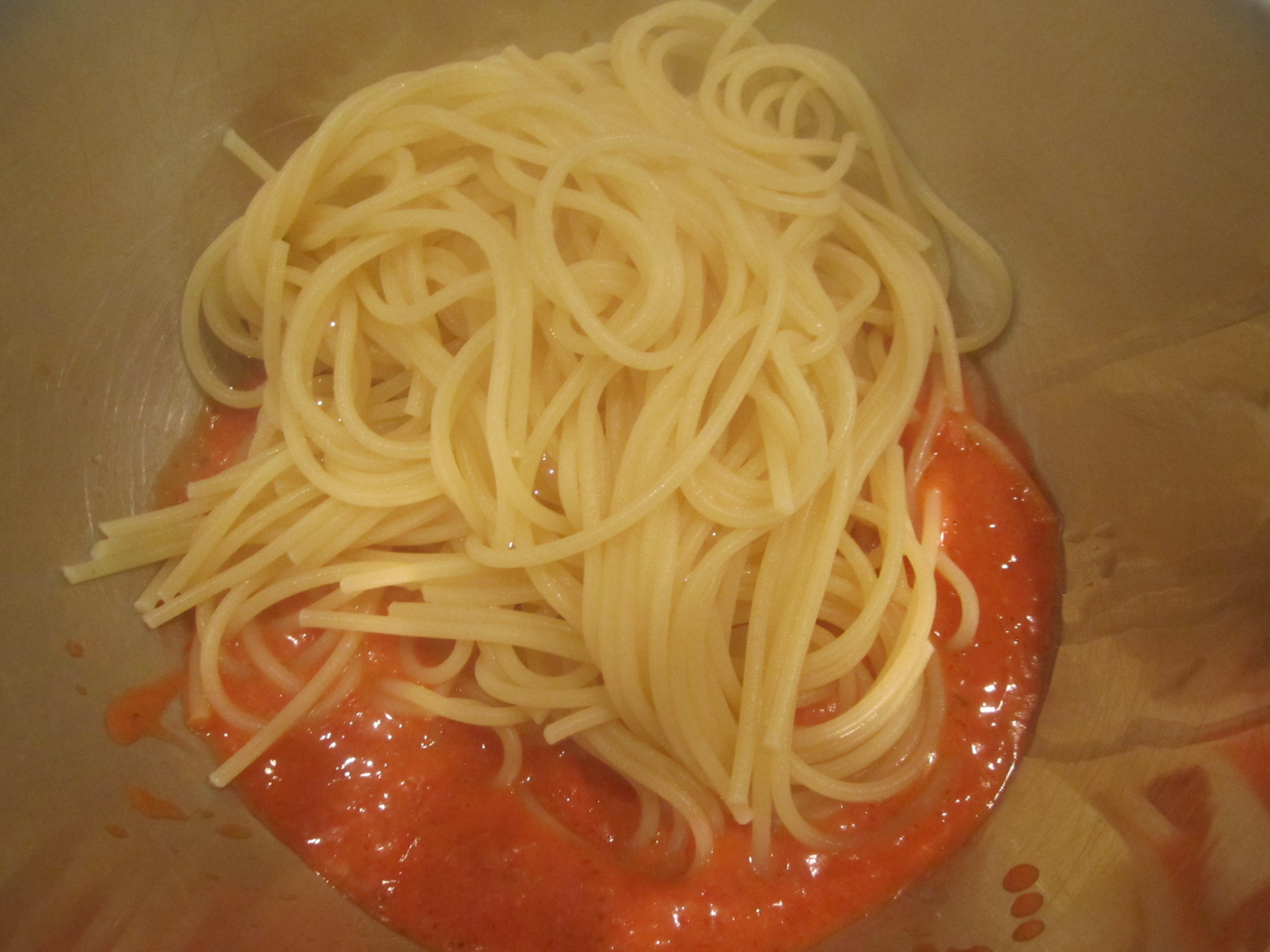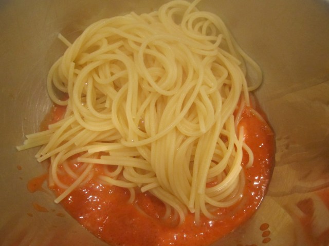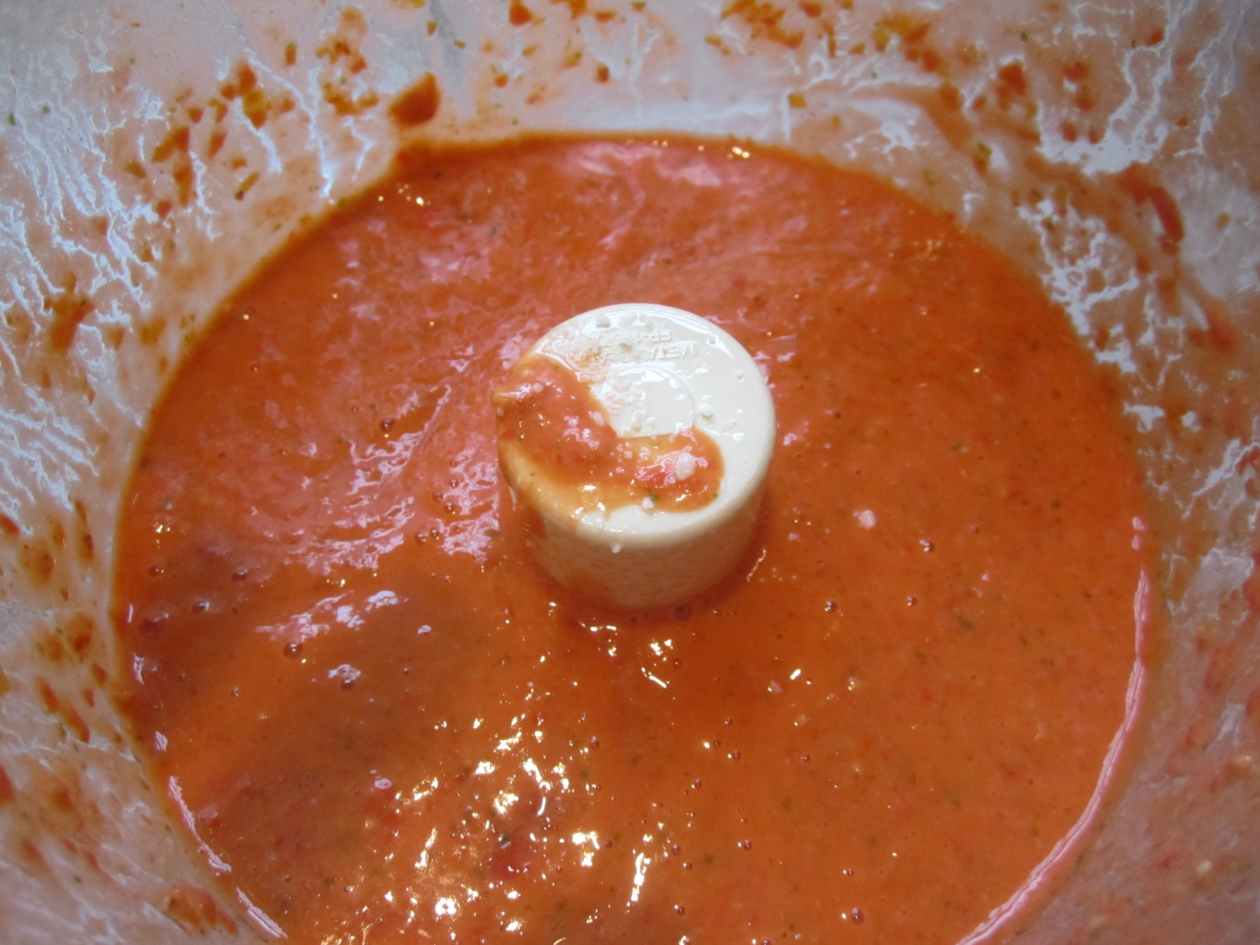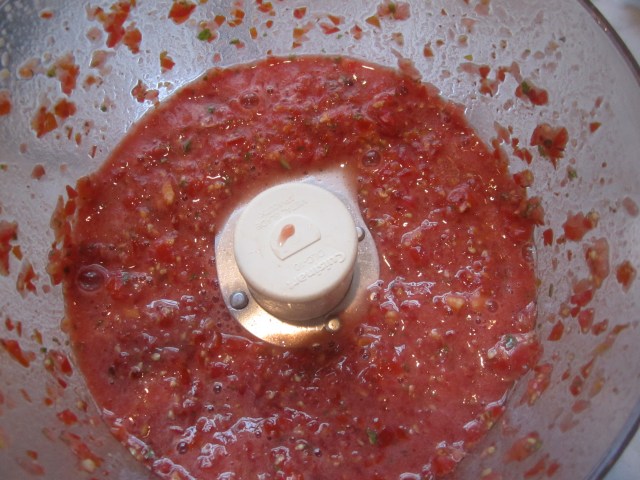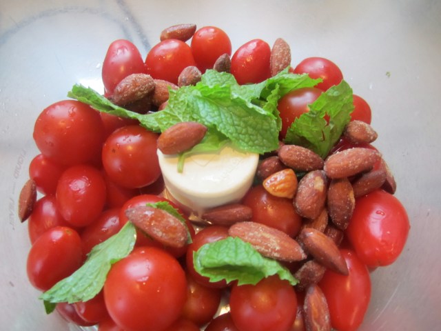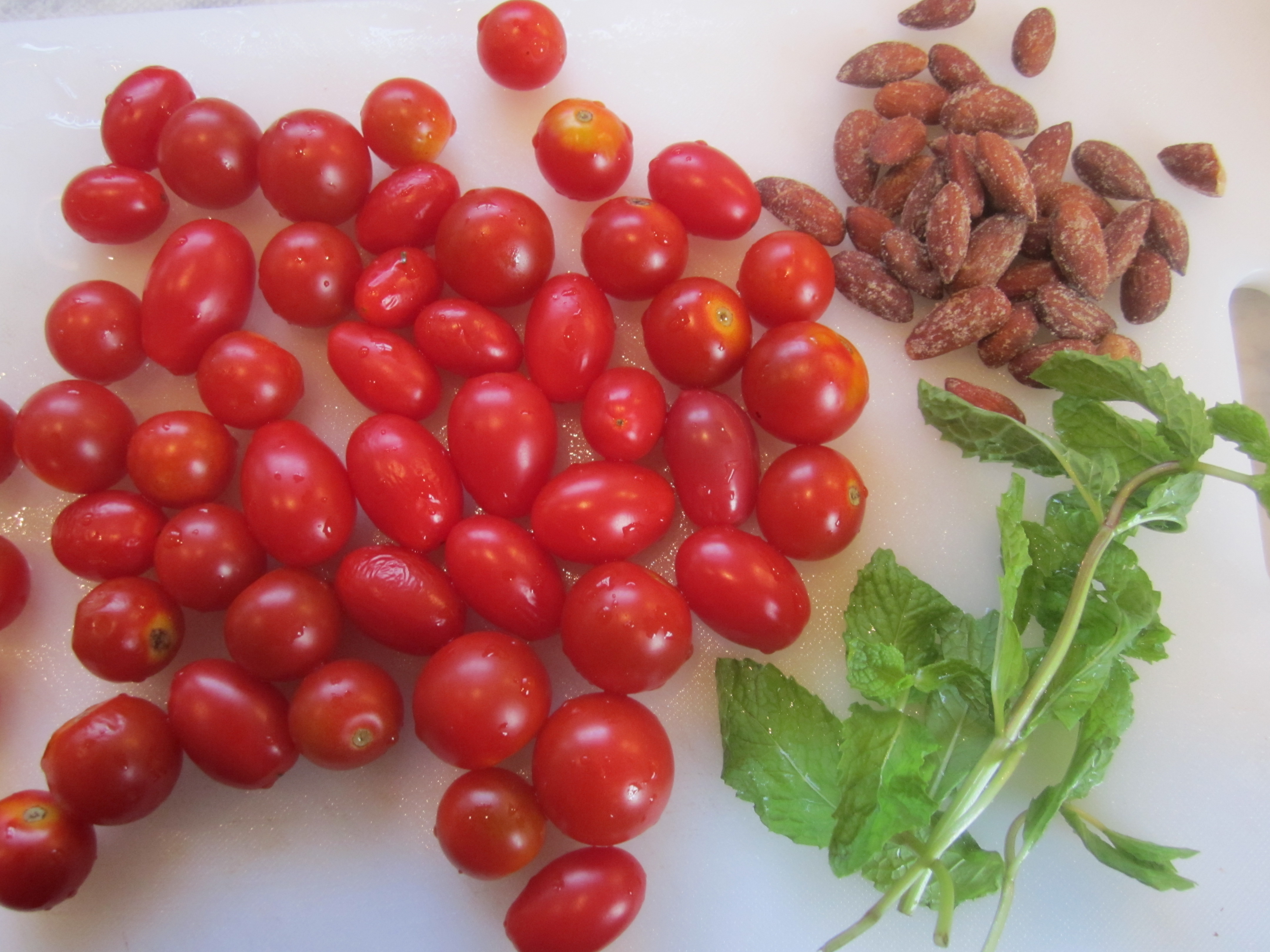 The sauce is traditionally made with cherry tomatoes, basil, almonds and garlic. I’ve deleted the garlic (not a fan of raw garlic), added mint and substituted smoked almonds for plain ones. No cheese is added to this sauce, but I’m sprinkling on lots of pecorino romano at the table.