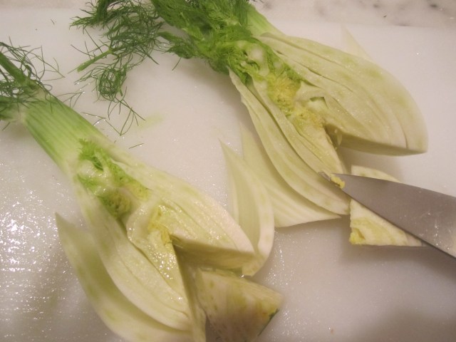 Remove stalk and outer layer of fennel bulbs and cut in half lengthwise. Remove triangular core from each half.