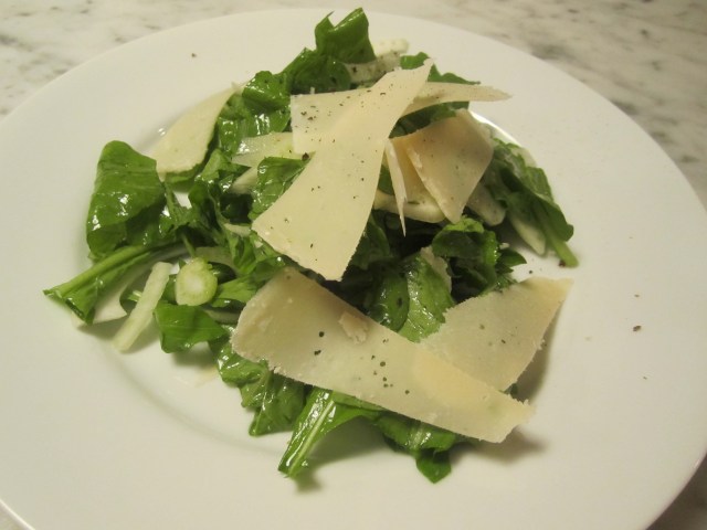 The dressing is simply lemon and olive oil–but it must be on the lemony side–it needn’t be excessively oily, since the richness will come from the parmigiano. Make and eat only at the last minute–arugula will wilt instantly.