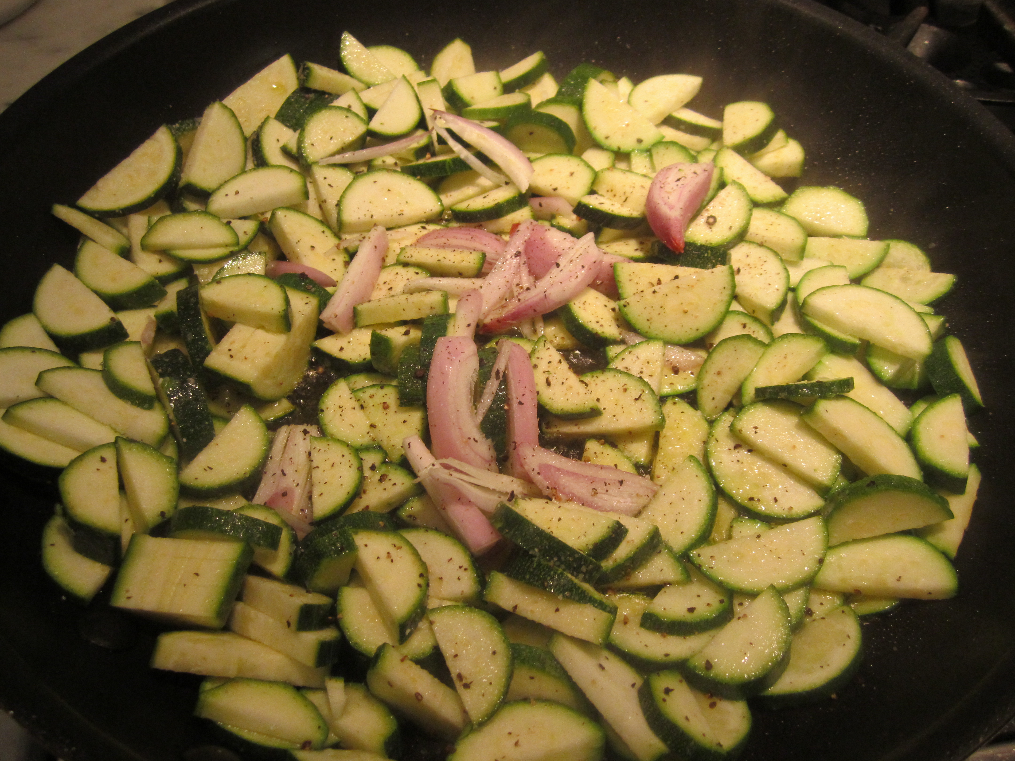 In a broad skillet place zucchini and shallot in 1/4 cup olive oil and sprinkle generously with at least 1/2 teaspoon salt. Saute for about 8 minutes, or until some slices are golden and caramelized, then set aside.