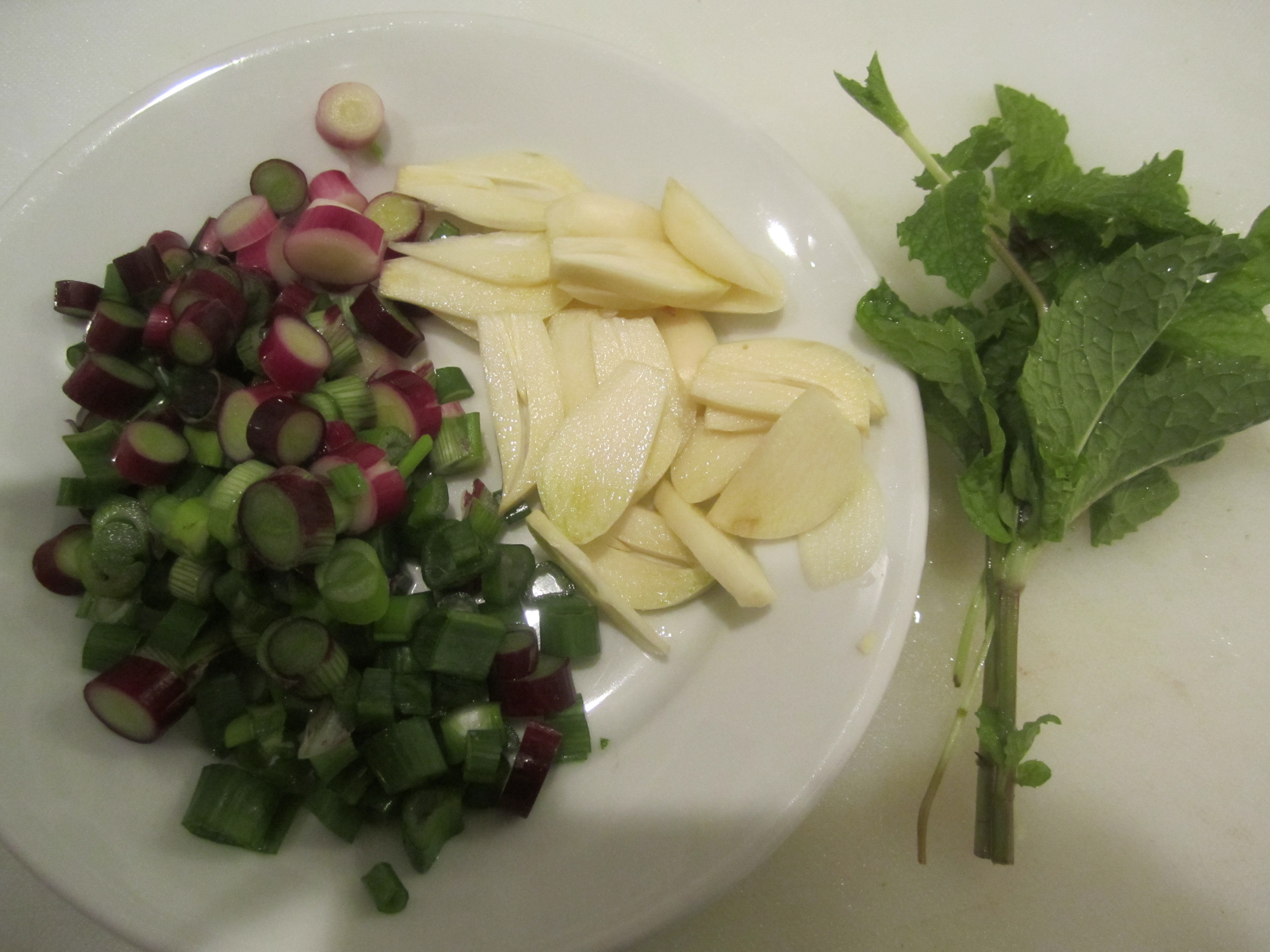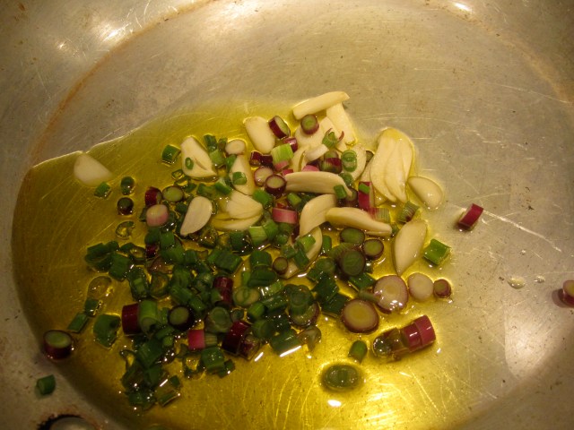 While pasta is cooking in plenty of salted water, in another skillet, saute garlic and scallion in remaining oil until they begin to become golden–about 2 minutes on low heat.