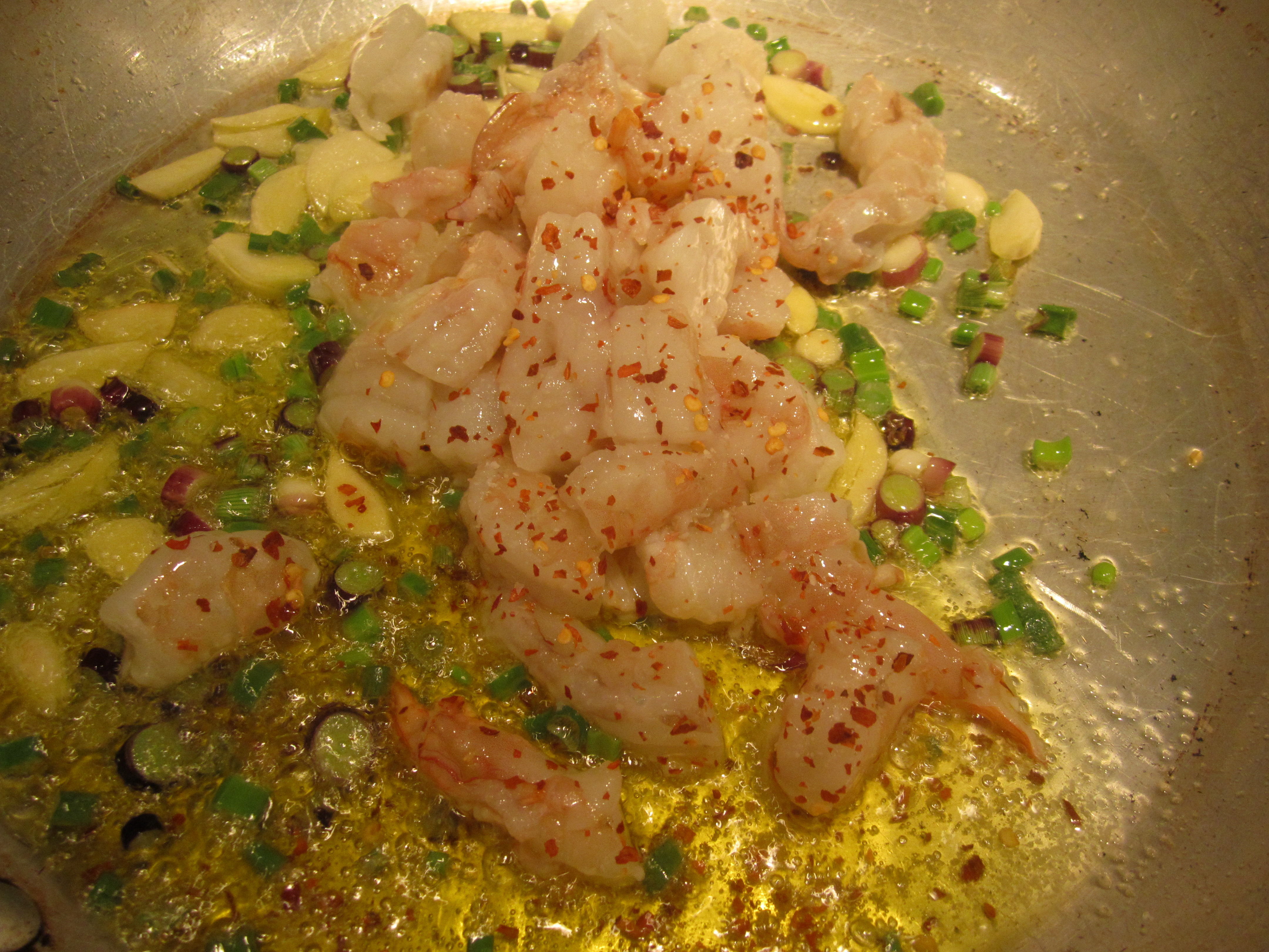 Raise heat to high and add shrimp, salt and some chili flakes.
