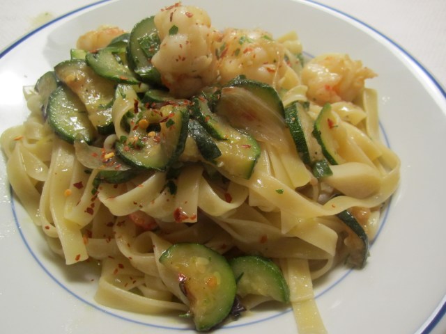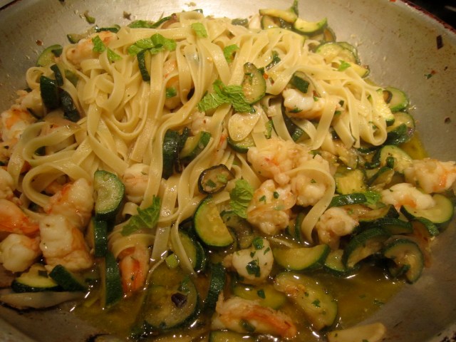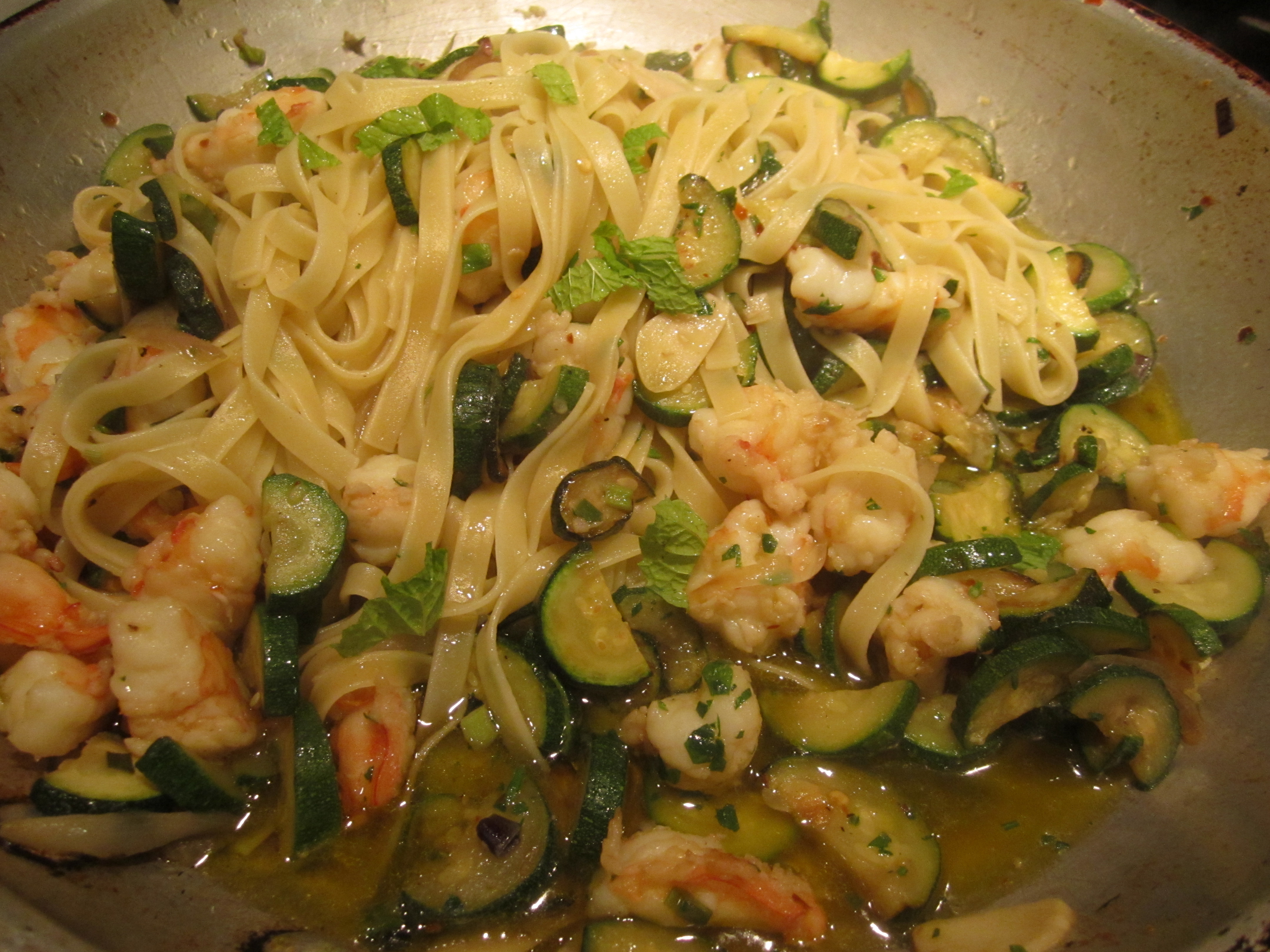 I decided to saute my zucchini separately from the shrimp because zucchini take longer to cook than shrimp, which take almost no time at all. Therefore, the zucchini and shallots were sauteed until lightly caramelized, then set aside while I made the rest of the dish. The zucchini were then folded into the dish right before the pasta. This is a refined, light and elegant pasta dish that is a beautiful main course by itself.