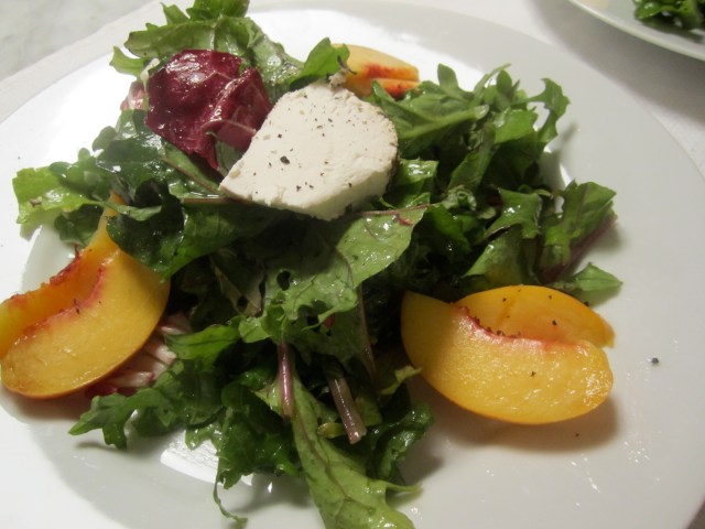 Tonight, I decided to start with a salad that features the same russian kale I served the other evening in my russian kale and beet salad. This time, instead of beets, I used fresh, sweet peaches (see my prior post for the exact recipe, and substitute raw peaches for golden beets). I got the idea for this salad from my friend Elle, who had it in a restaurant the other evening and texted me a photo of it. It’s an appealing cross between a salad and a dessert. Try it while peaches are still sweet and juicy–we won’t have them much longer.