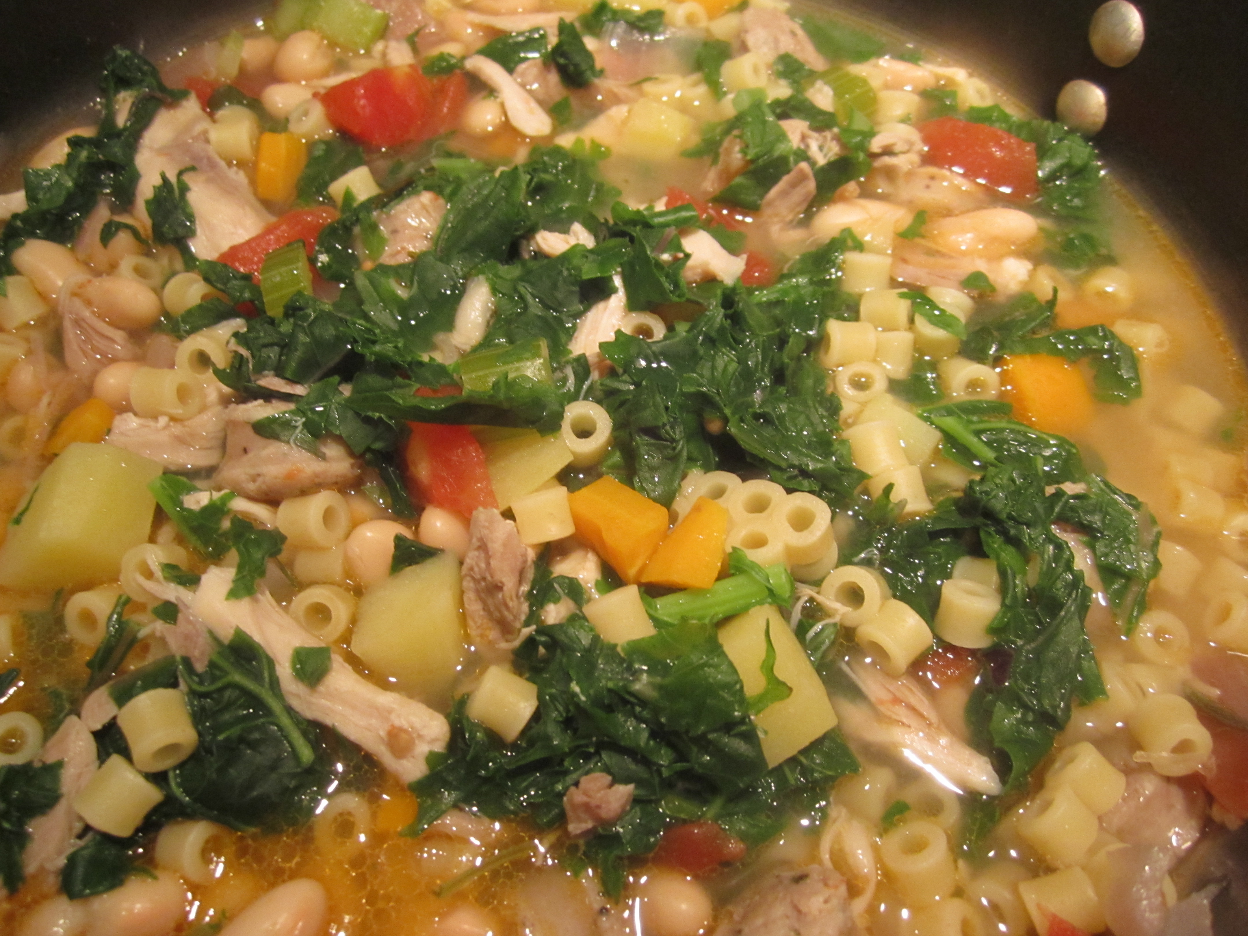 Place broth, vegetables (except beans), and chicken meat in broth and simmer for approximately 15 minutes. Cook pasta separately until 2 minutes shy of done. Add pasta and beans to broth and simmer for a couple of minutes.