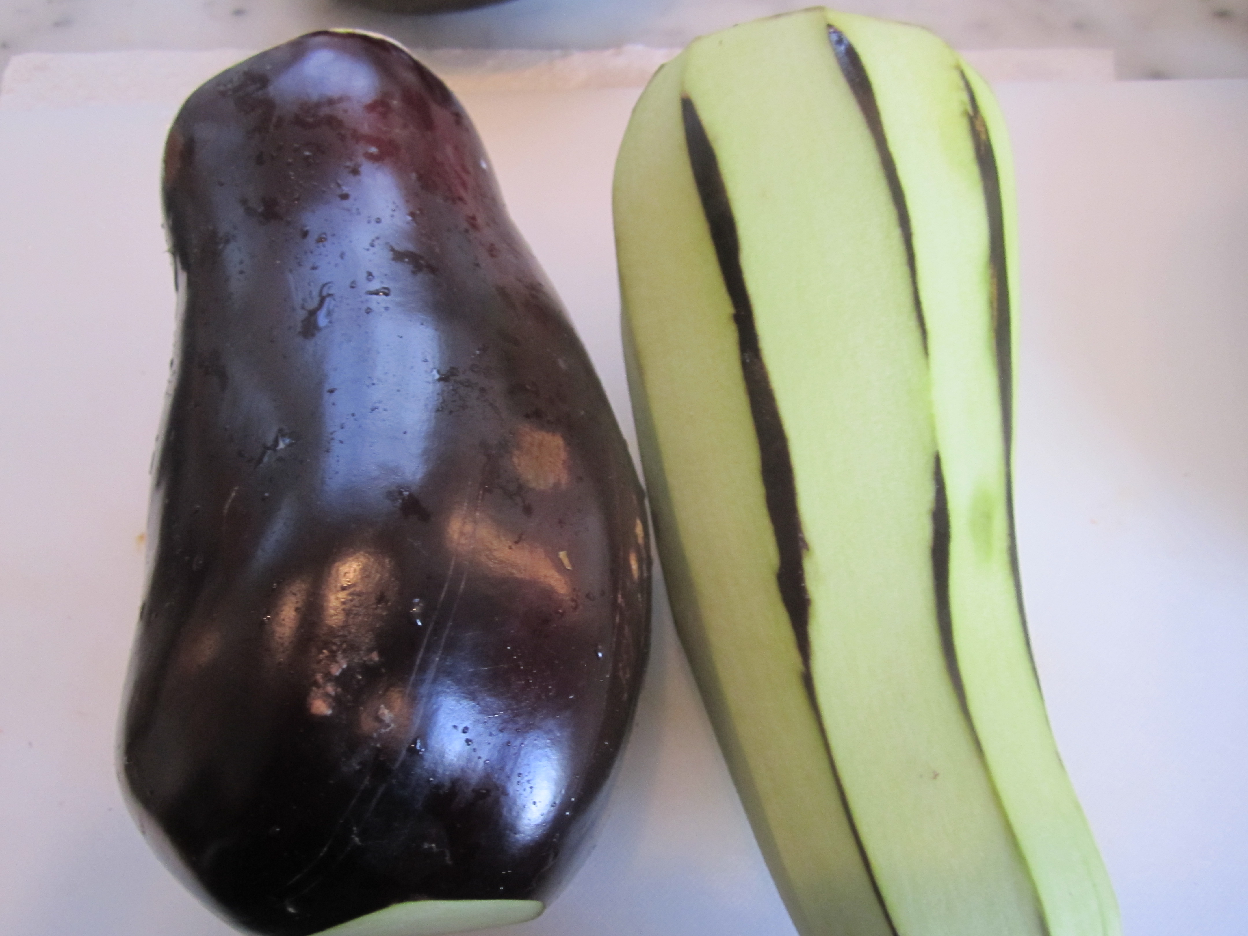 Peel the eggplant (leaving some stripes of peel on for flavor).