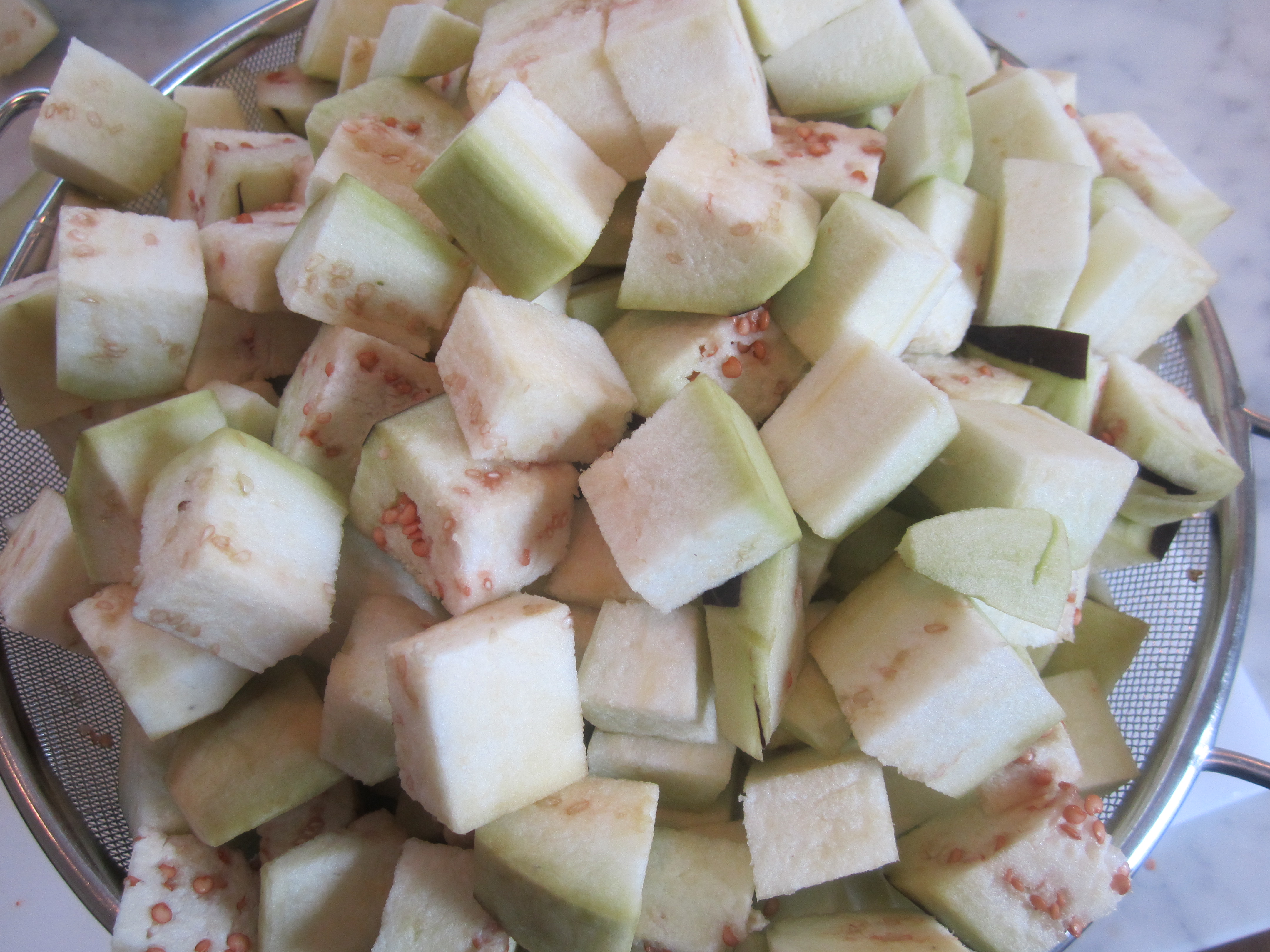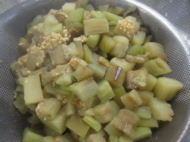 In a large pot of salted boiling water, drop in peeled, diced eggplant cubes. Don’t worry about crowding the pot, just pack it all in and keep stirring the eggplant and pressing the cubes down into the boiling water. Boil for 15 – 20 minutes, or until eggplant is tender and translucent.