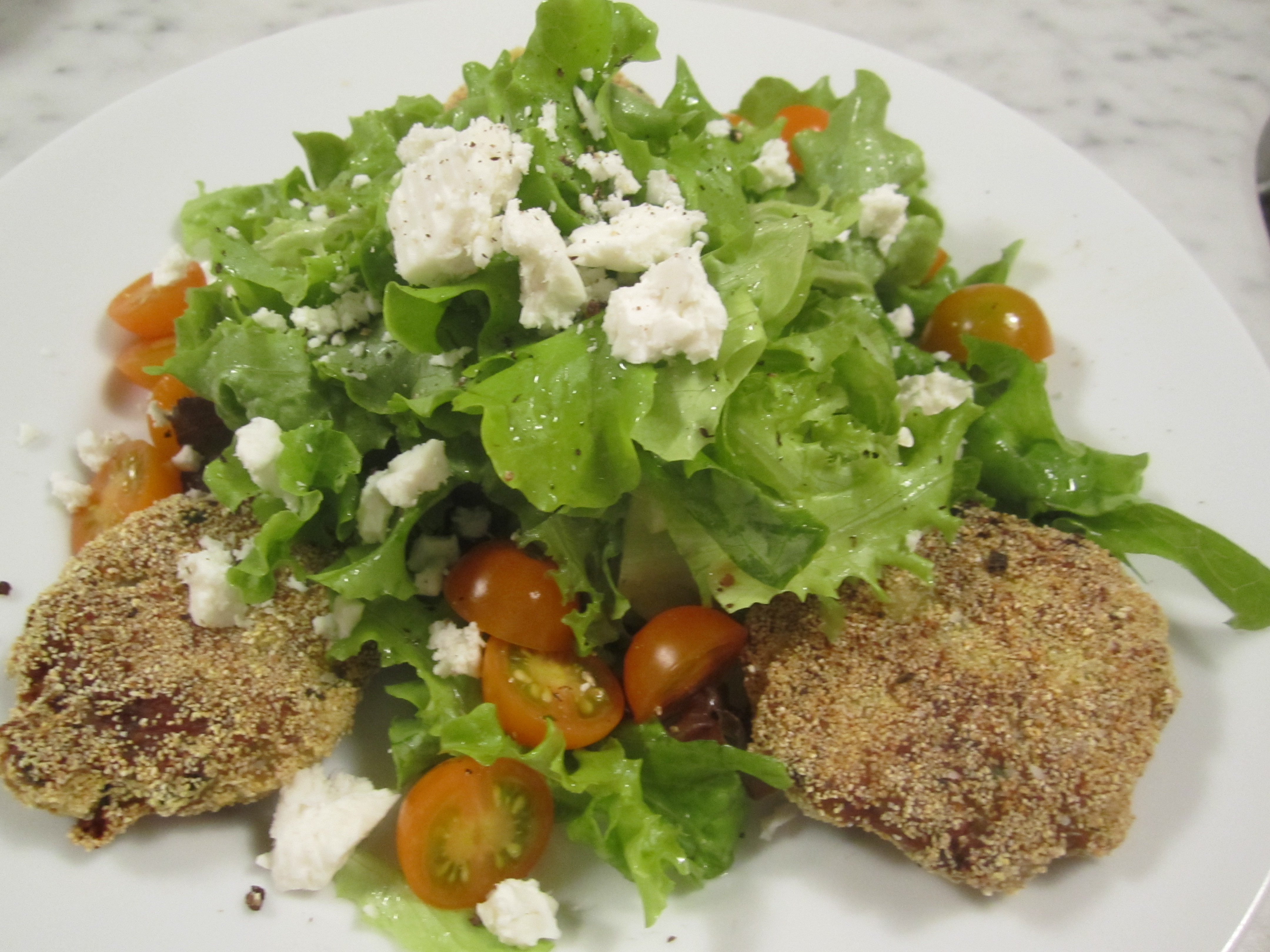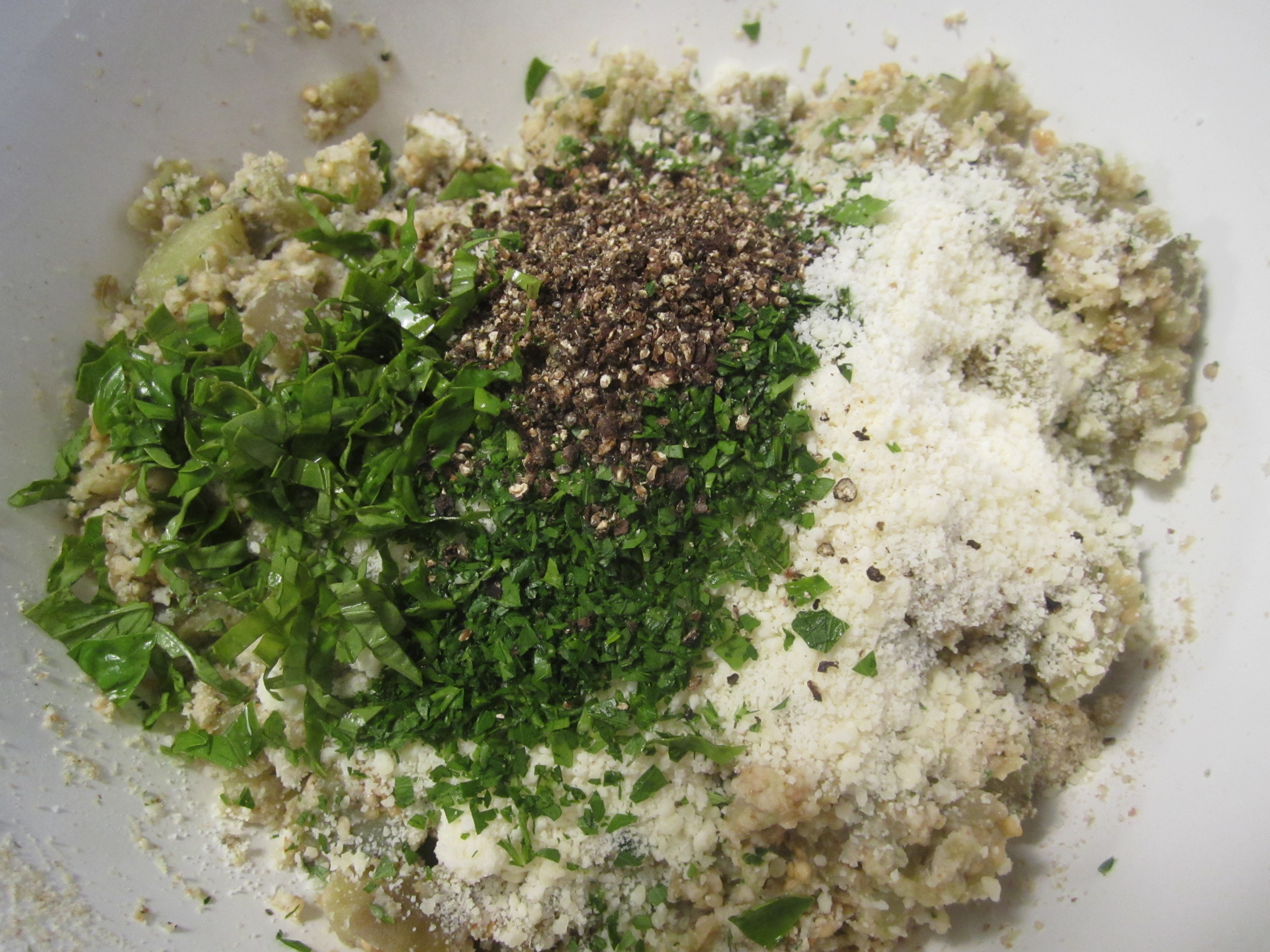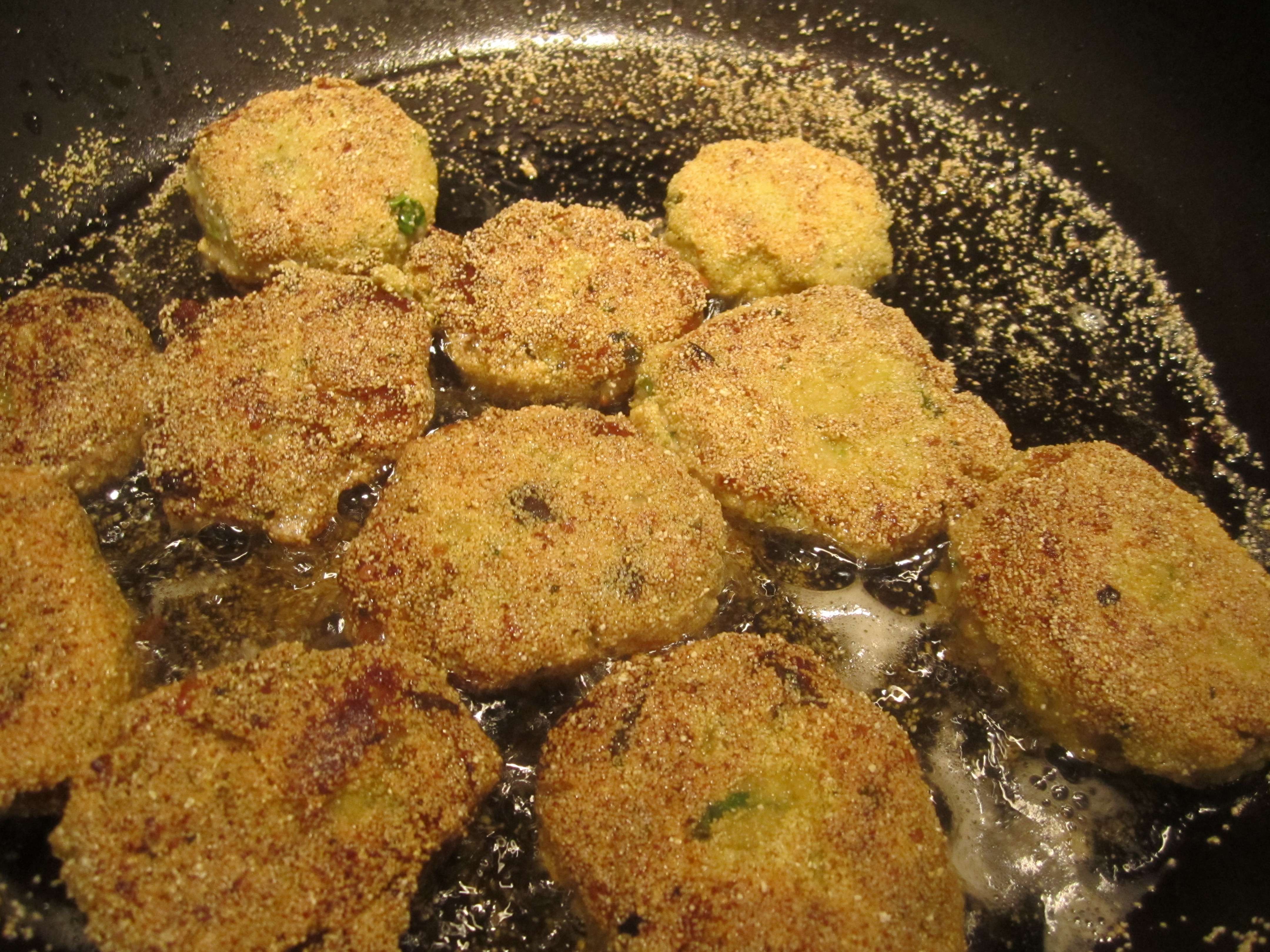 They require a bit of advance preparation, but this can be done the day (or days) before. The eggplant gets peeled and diced, then drained well and squeezed well. Then the breadcrumbs are added–seasoned ones. Generous amounts of pecorino romano and black pepper are added. Fresh chopped parsley and basil are added as well. The whole mixture is kneaded and incorporated with hands, then formed into patties. The patties are then dredged in additional bread crumbs, then pan fried in olive oil.