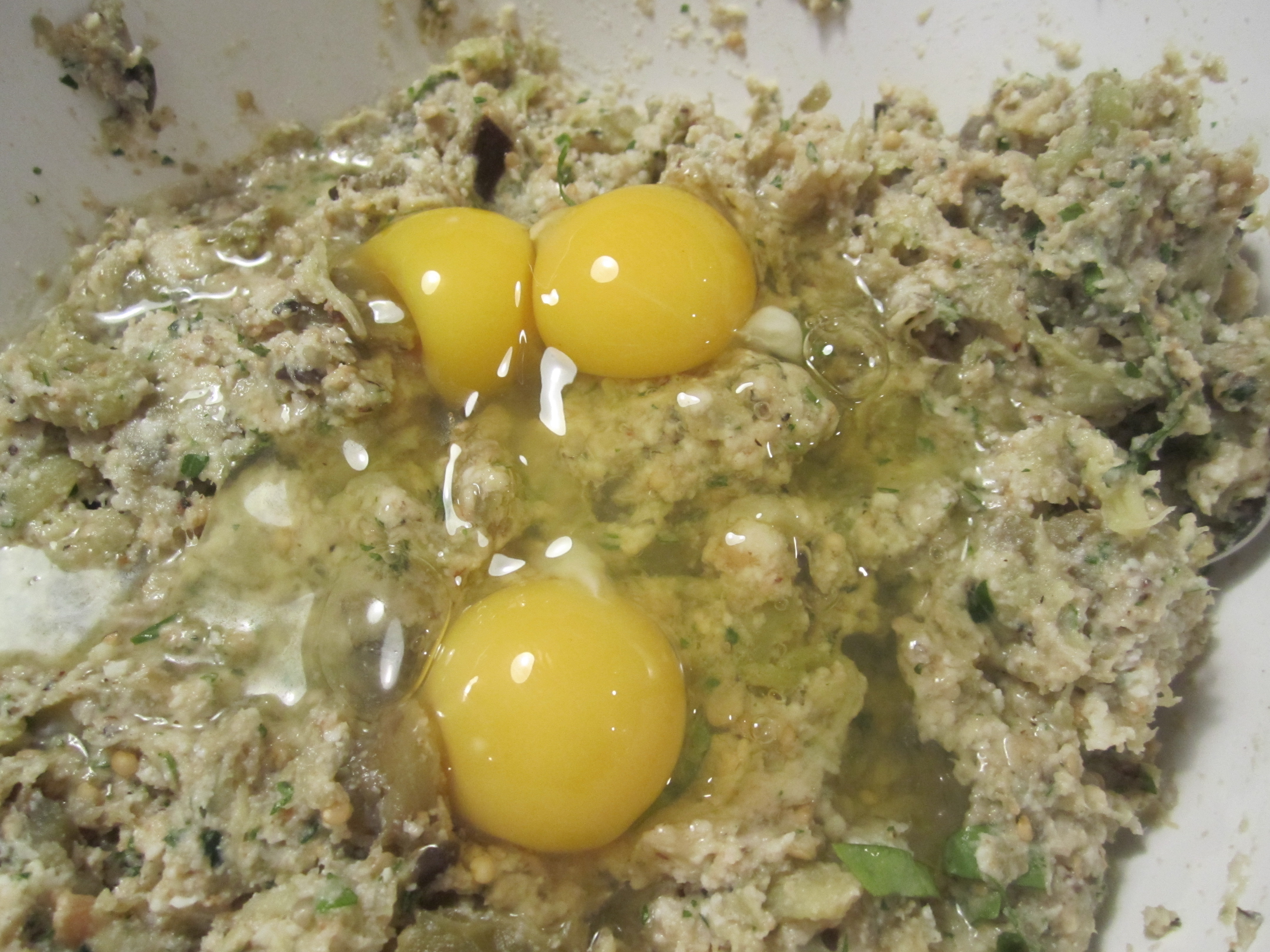 Place eggplant in a large mixing bowl, then top with remaining ingredients, except eggs.