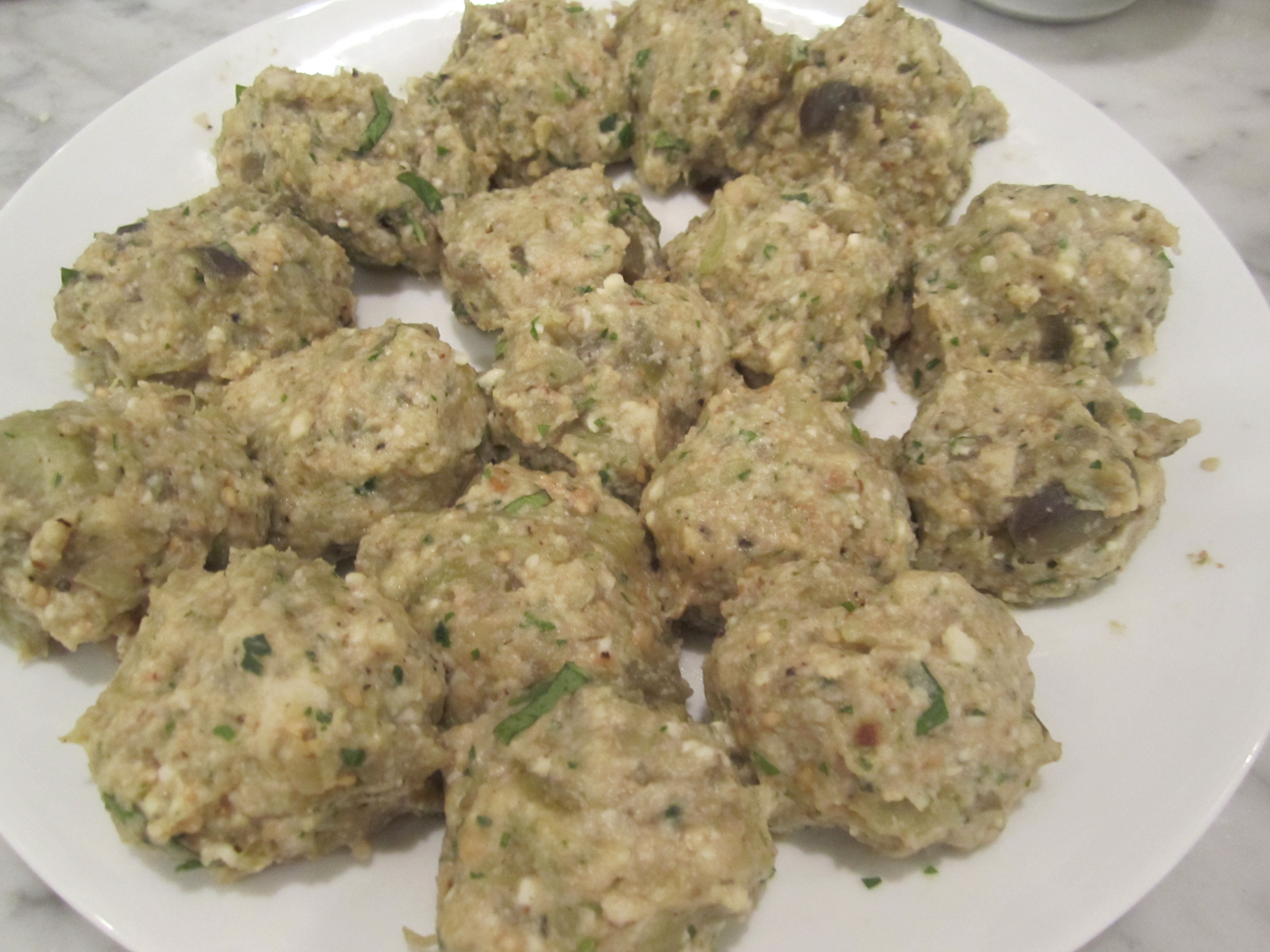 The beauty of these fritters is that they can be prepared partly or entire ahead of time, then frozen. For example, you can boil and drain the eggplant, then refrigerate it a few days (in a strainer, covered with plastic) or freeze it indefinitely, then proceed with the recipe. Or–you can make the entire mixture and refrigerate it a couple of days (or freeze it indefinitely), then form the patties and dredge and fry. Or–you can make the fritters completely, freeze them, then toast them in a 400 degree oven on a baking tray until they become crispy again. In no way do any of these advance preparations impact on the quality of the fritters–they hold beautifully in the freezer.