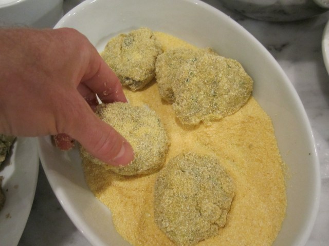 Dredge patties in fine cornmeal, then shake off excess.