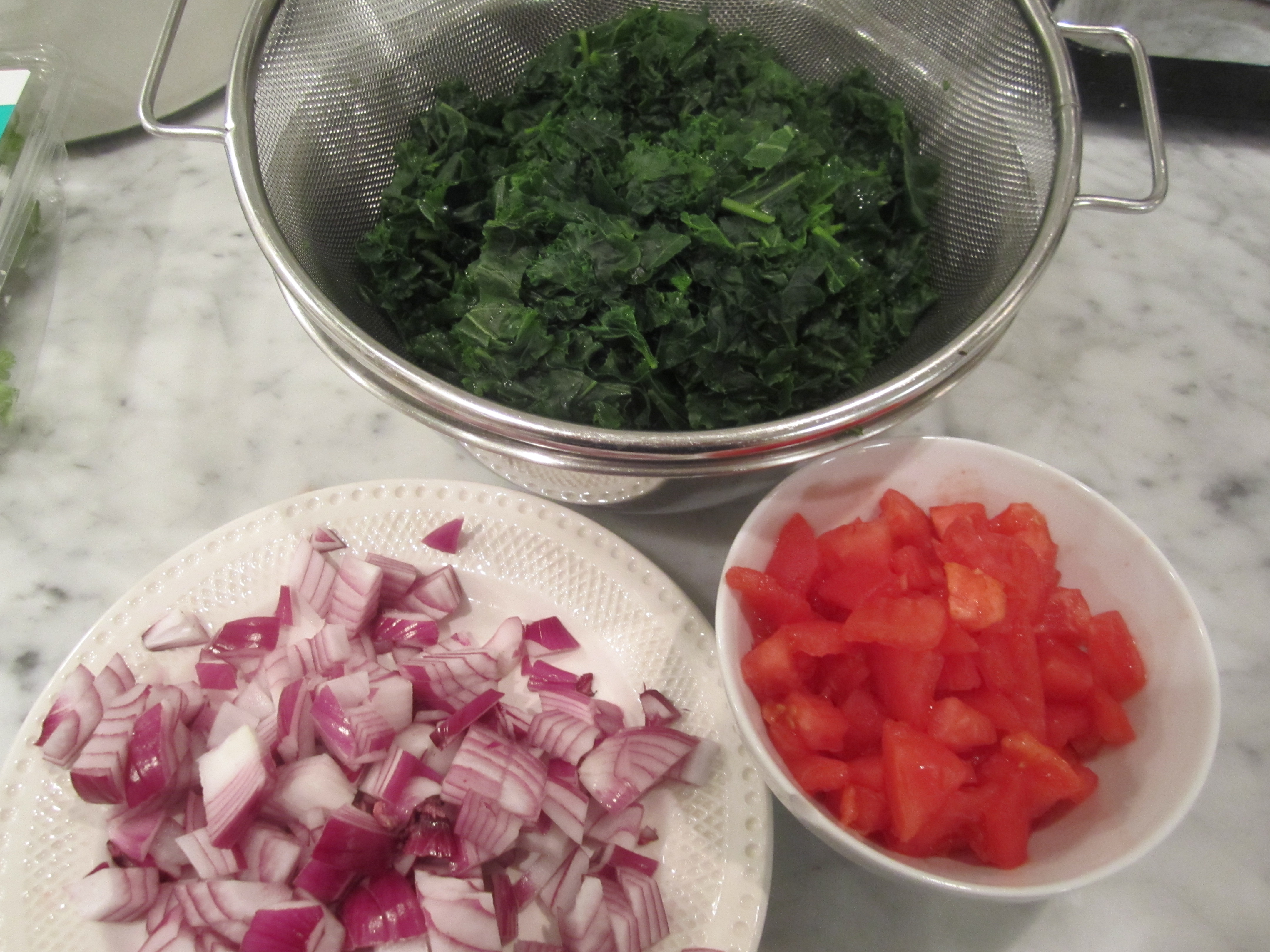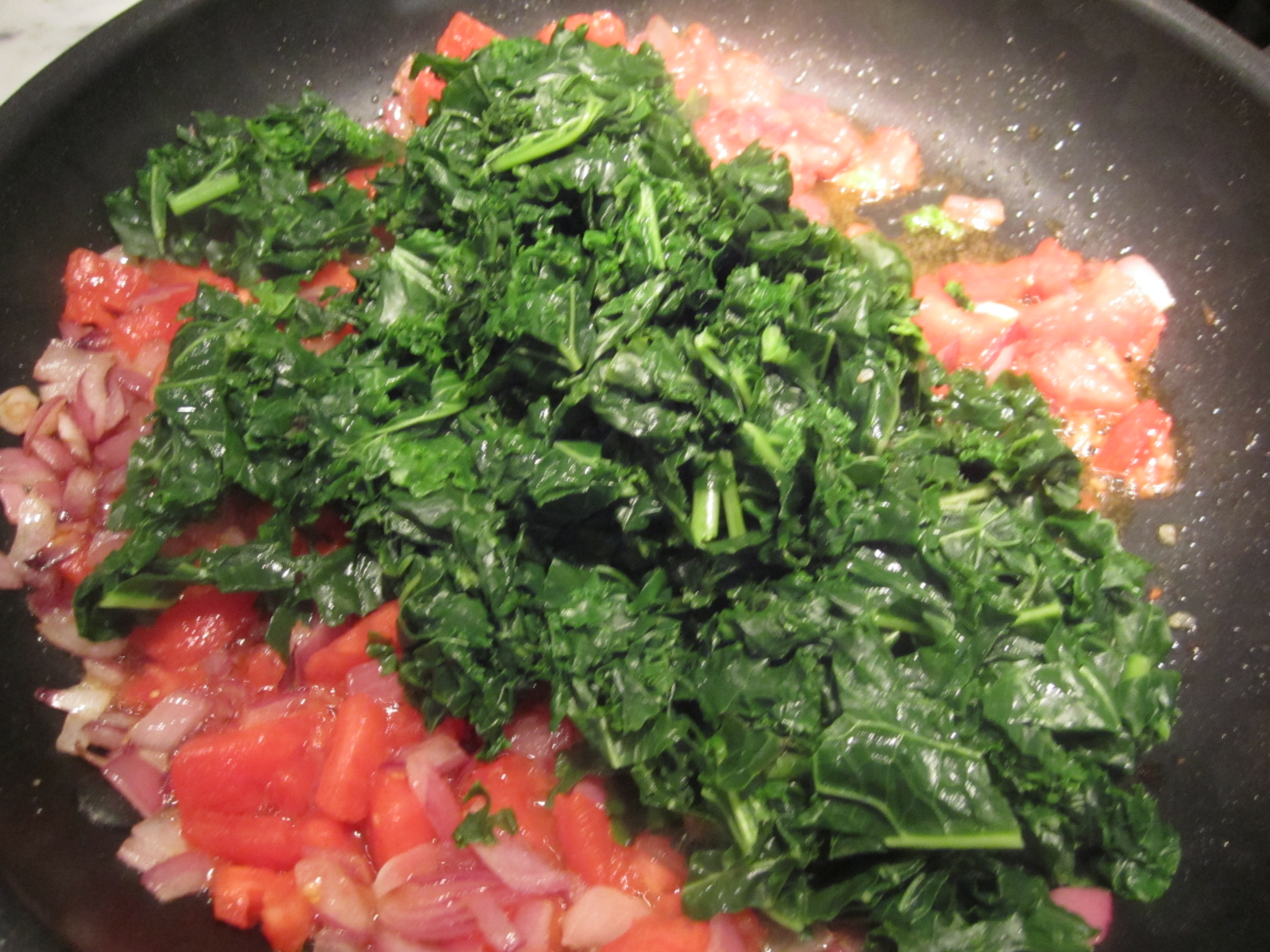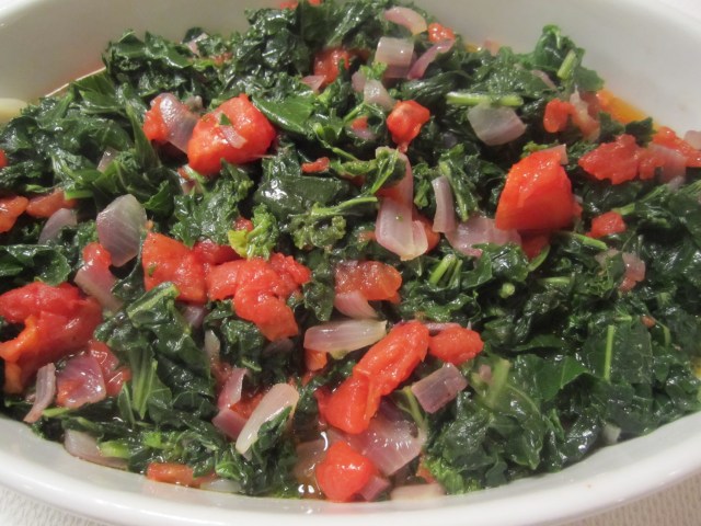 The onions get sauteed until soft and beginning to caramelize, then the tomatoes get added and sauteed briefly. The kale is tossed into the skillet and all is combined. The whole mixture gets a drizzle of raw extra-virgin olive oil, and the dish can be presented either hot or at room temperature.