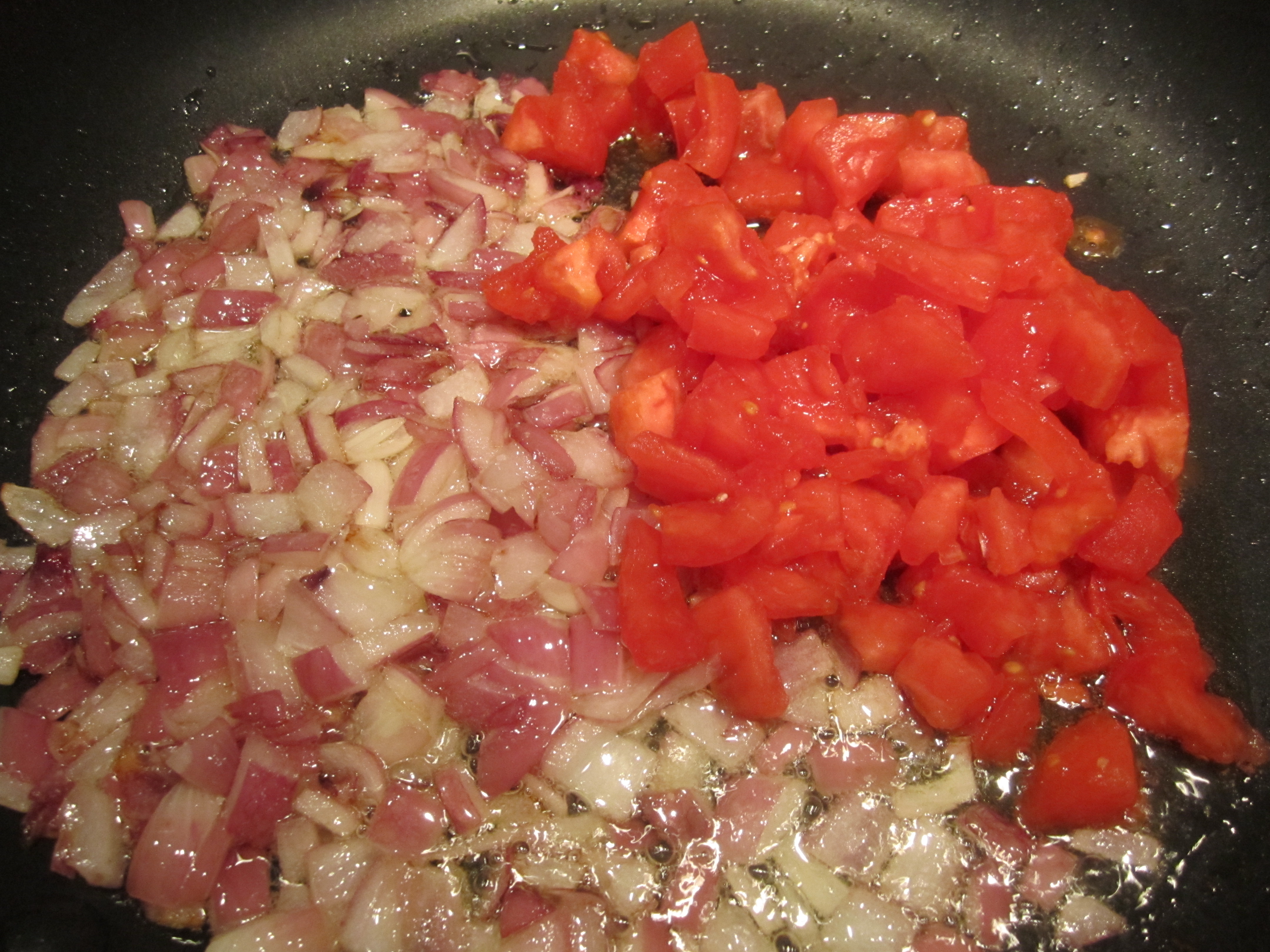 In a broad skillet on low heat, brown the onions in 1/4 cup of olive oil until lightly caramelized (about 7 – 9 minutes). Add in diced tomatoes.