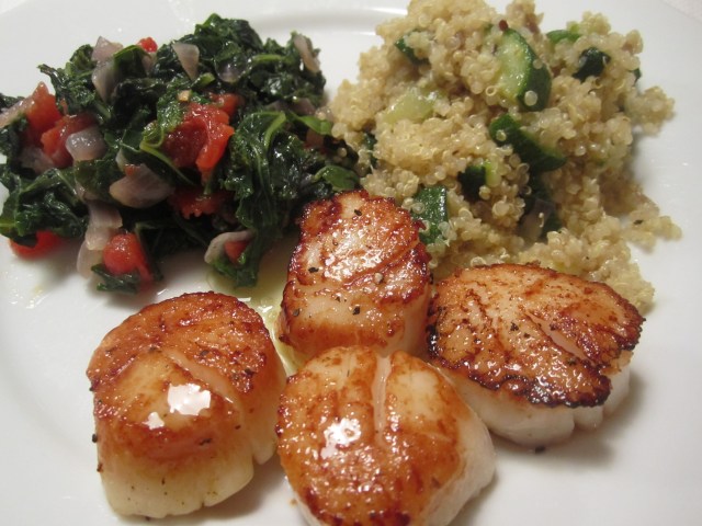 Tonight, the rest of our meal consisted of our local favorite–seared Montauk scallops and quinoa with zucchini. Summer’s not over yet!