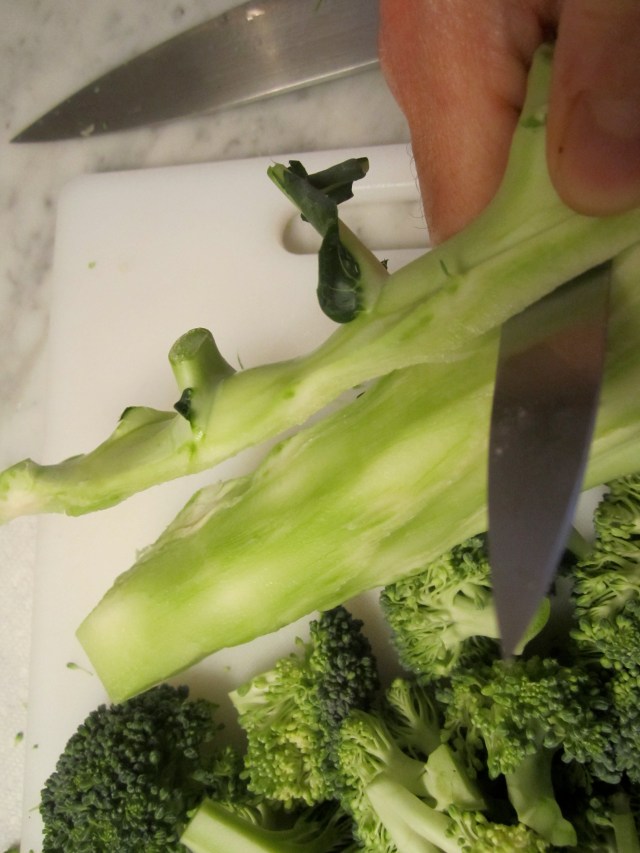Remove broccoli florets from stem, and peel stem mercilessly with a paring knife–remove all fibrous outer layers. Dice into 1/2″ cubes.