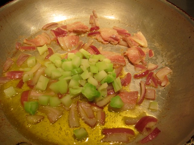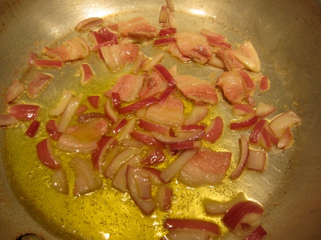 In a broad skillet over low heat, pour half the olive oil and render the salt pork for about 5 minutes, then add onions and continue sauteing on low heat for another 5 minutes.