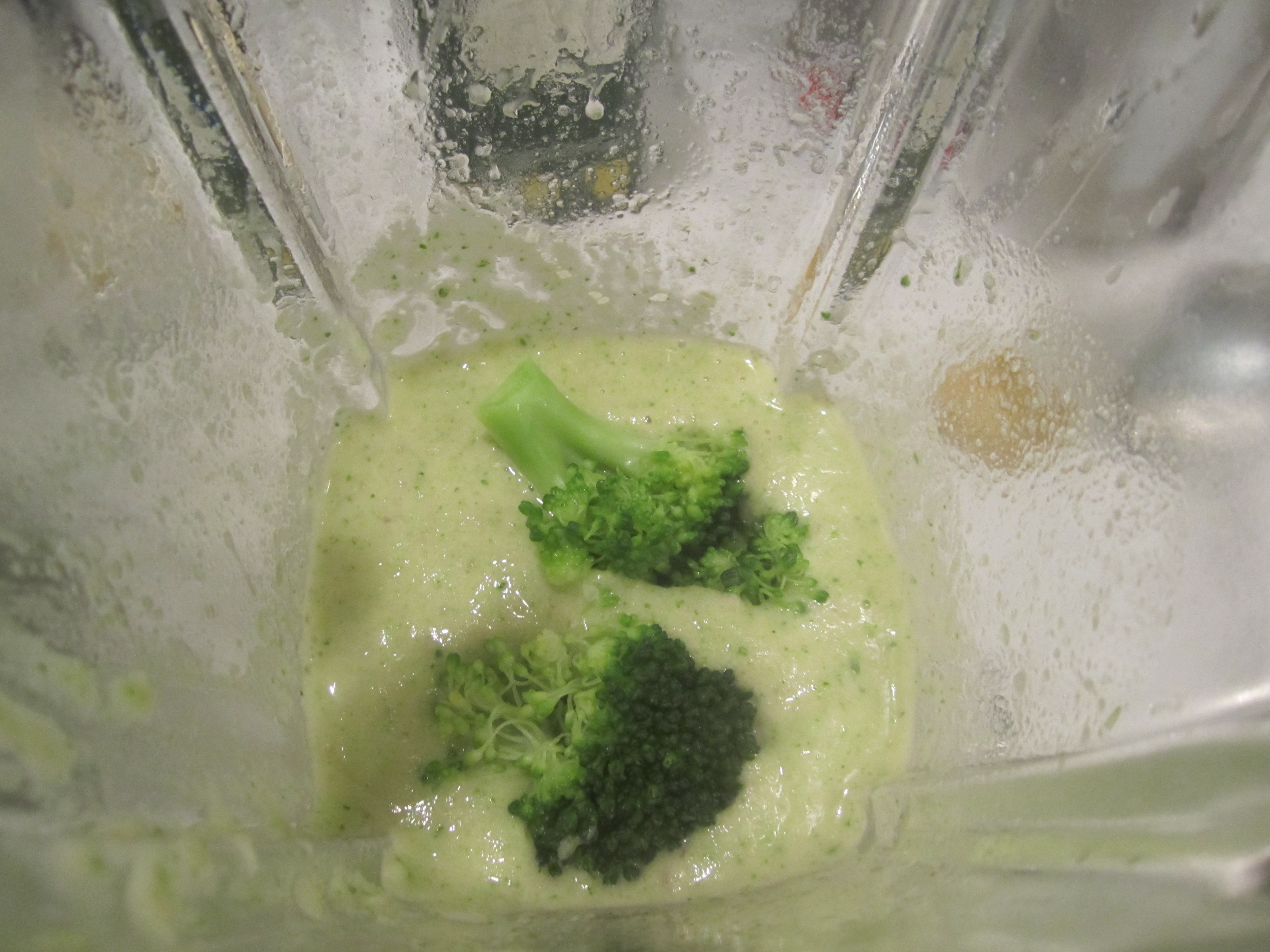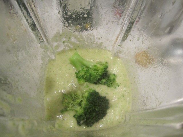 Pour the rest of the mixture from the saute pan into blender, along with a cup of broccoli cooking liquid. Process until a smooth puree results. Add 3 or 4 florets of broccoli to the blender and continue to process to a puree.