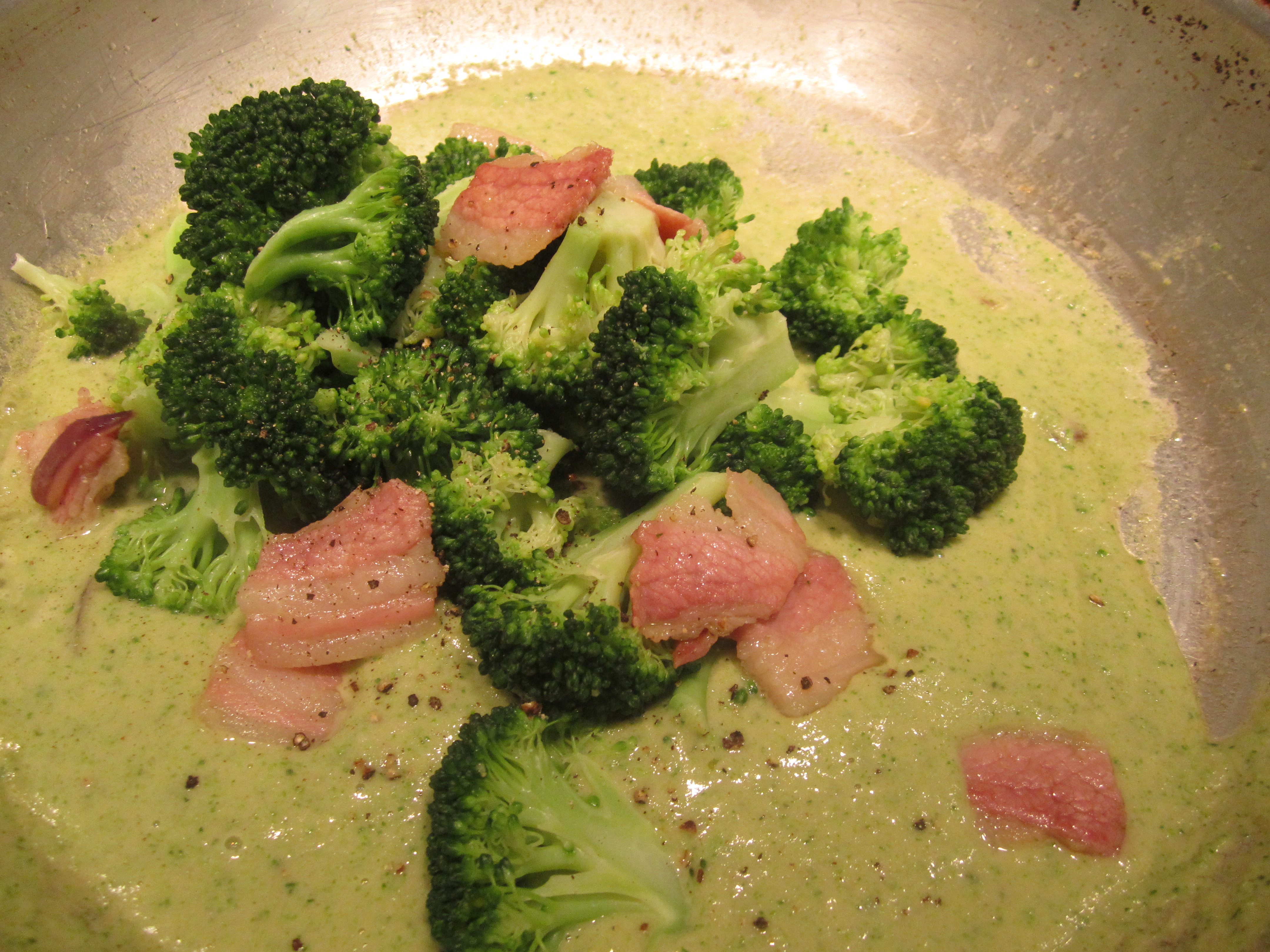 The thing I love about this technique is that it uses the entire stalk of broccoli–stem and all. Simply peel and dice the stem, boil and saute with salt pork and onions. Boil the florets separately and set aside. Make a puree of the stems, some of the florets, and half the salt pork and onion mixture. The remaining broccoli florets and pieces of salt pork remain whole.