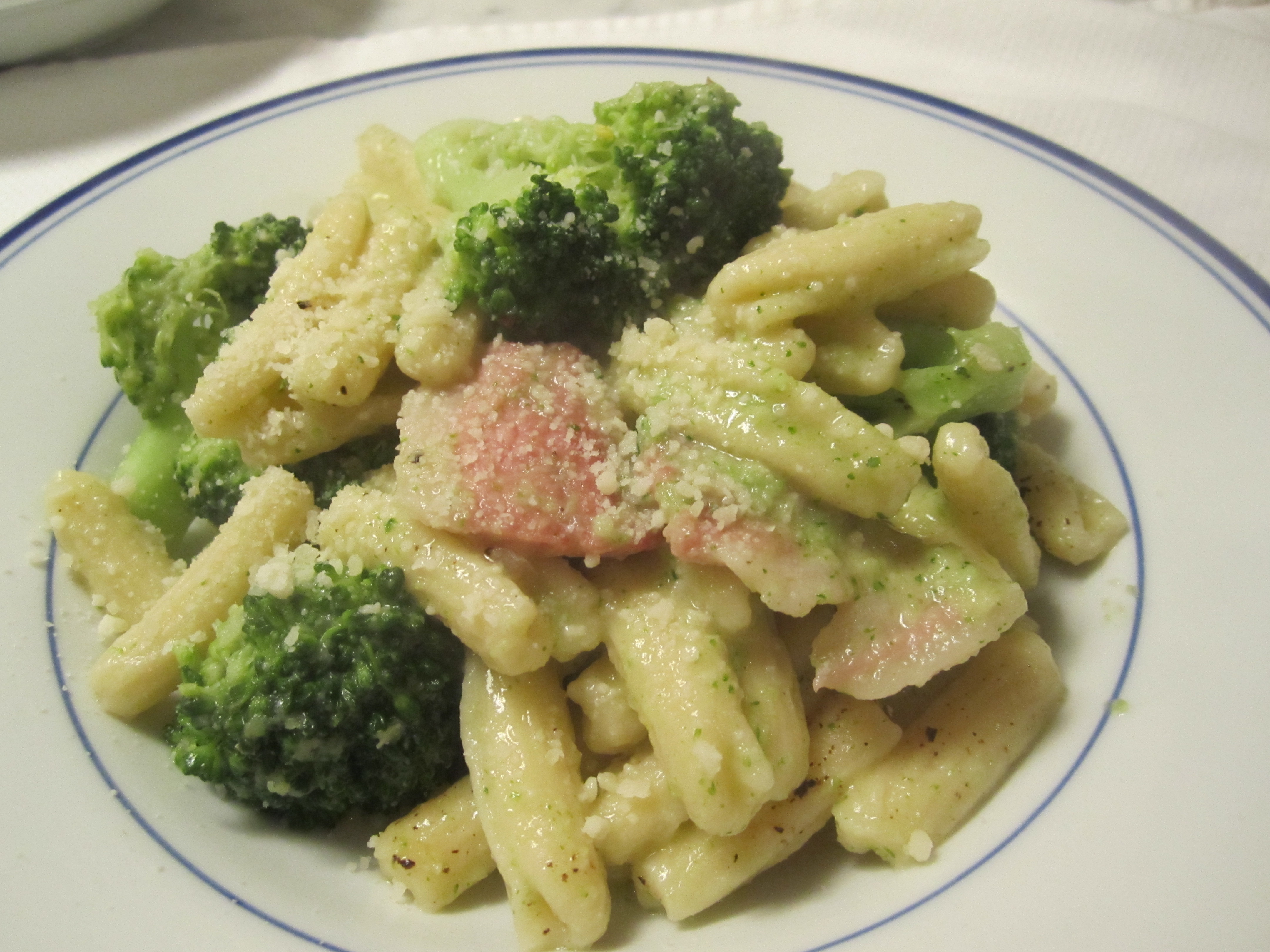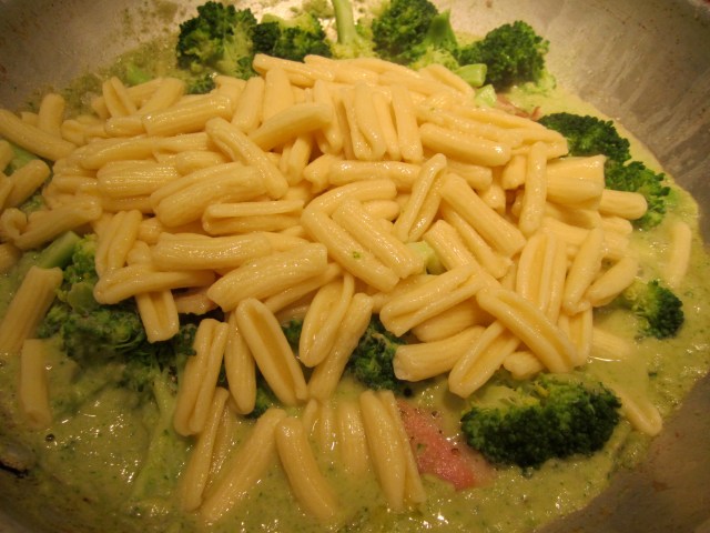 Return the puree to the saute pan, along with the florets and slices of salt pork. Simmer on lowest heat while cavatelli cook. Drop cavatelli inro the boiling broccoli cooking liquid (add some water if too much has evaporated), and cook until done.