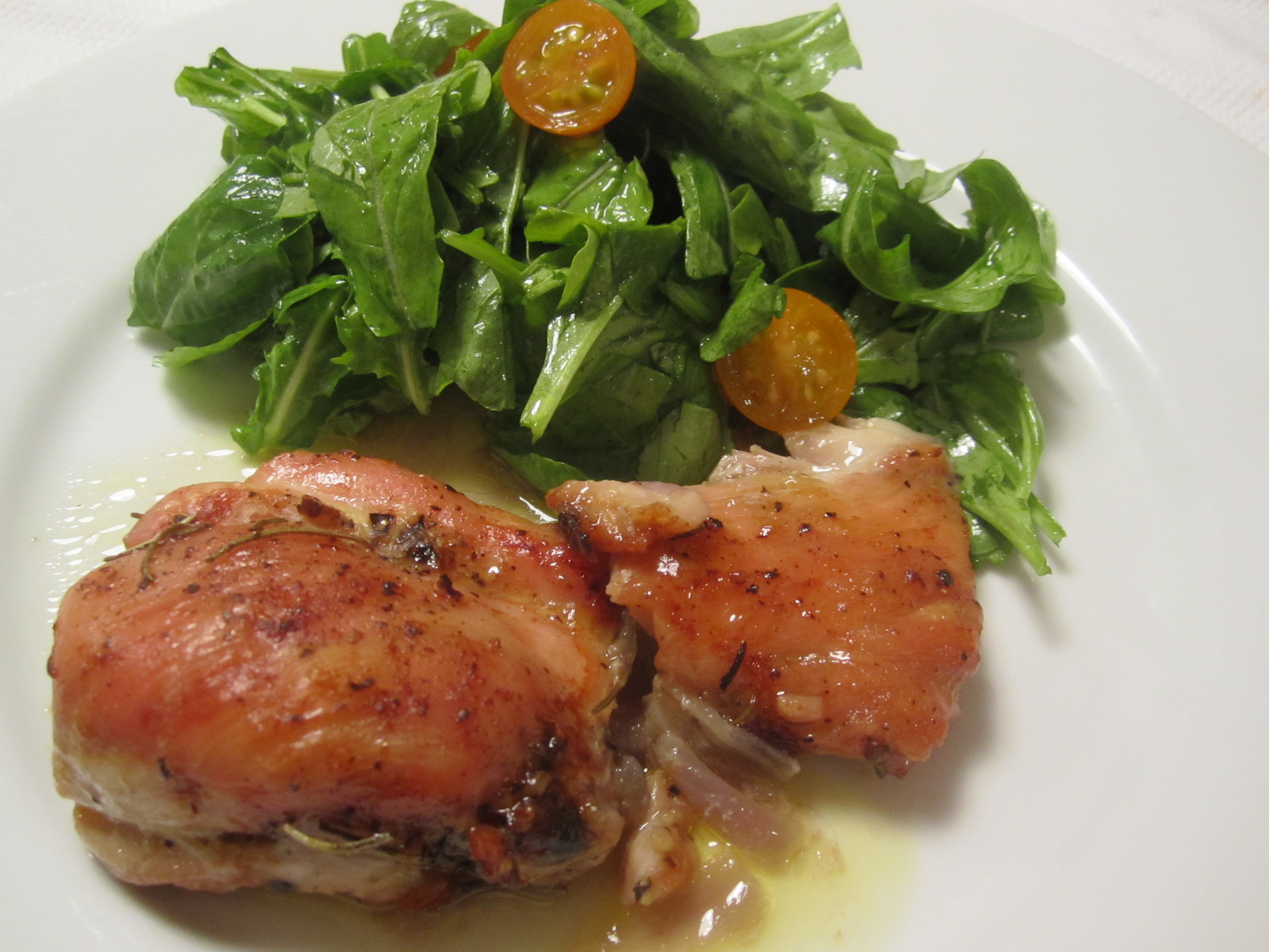 Tonight, we had this pasta as our first course. Our main course was Beppi’s Broiled Chicken Thighs with Rosemary, and a salad of arugula and cherry tomatoes, dressed with lemon and olive oil.