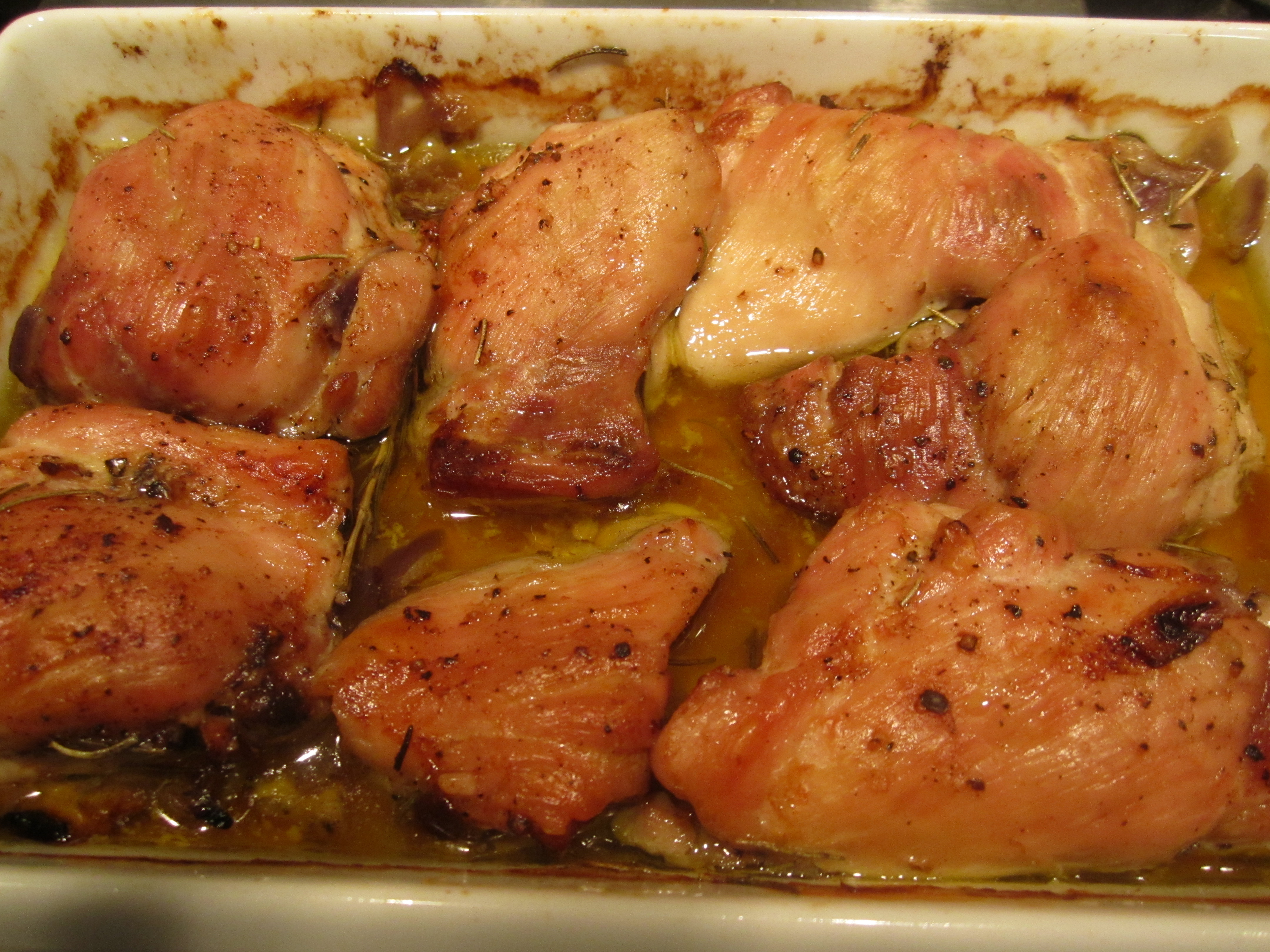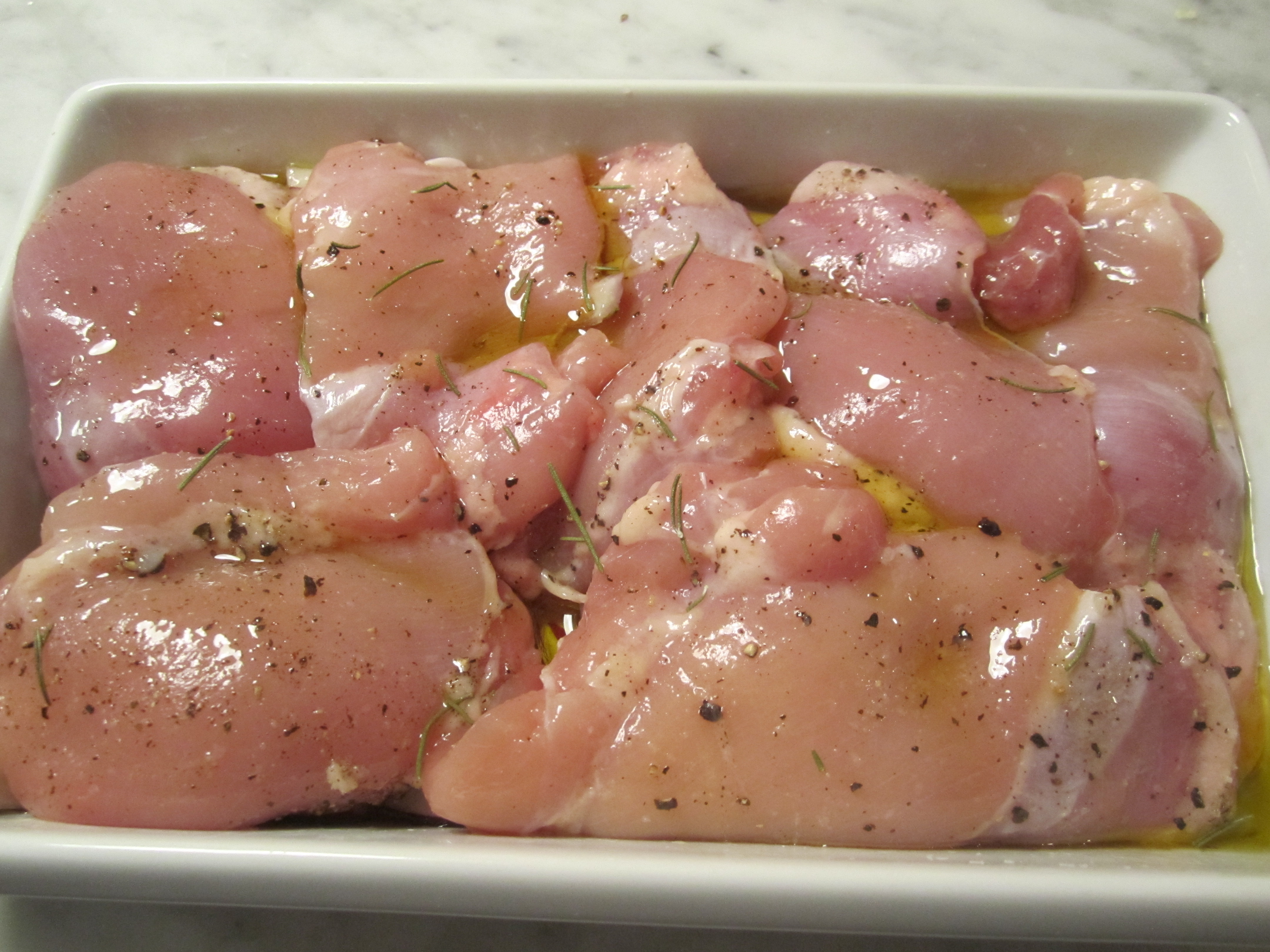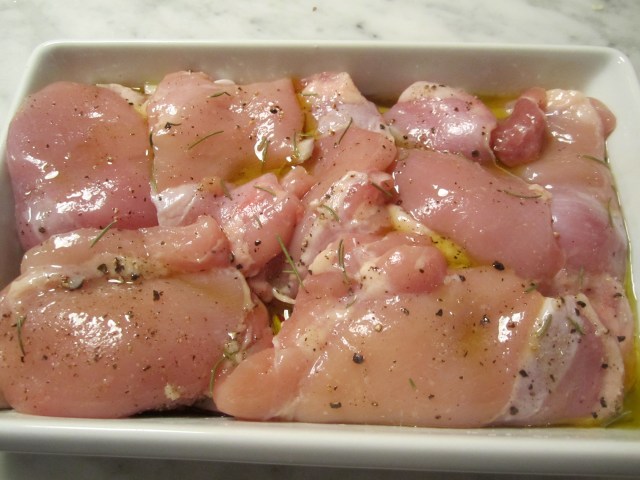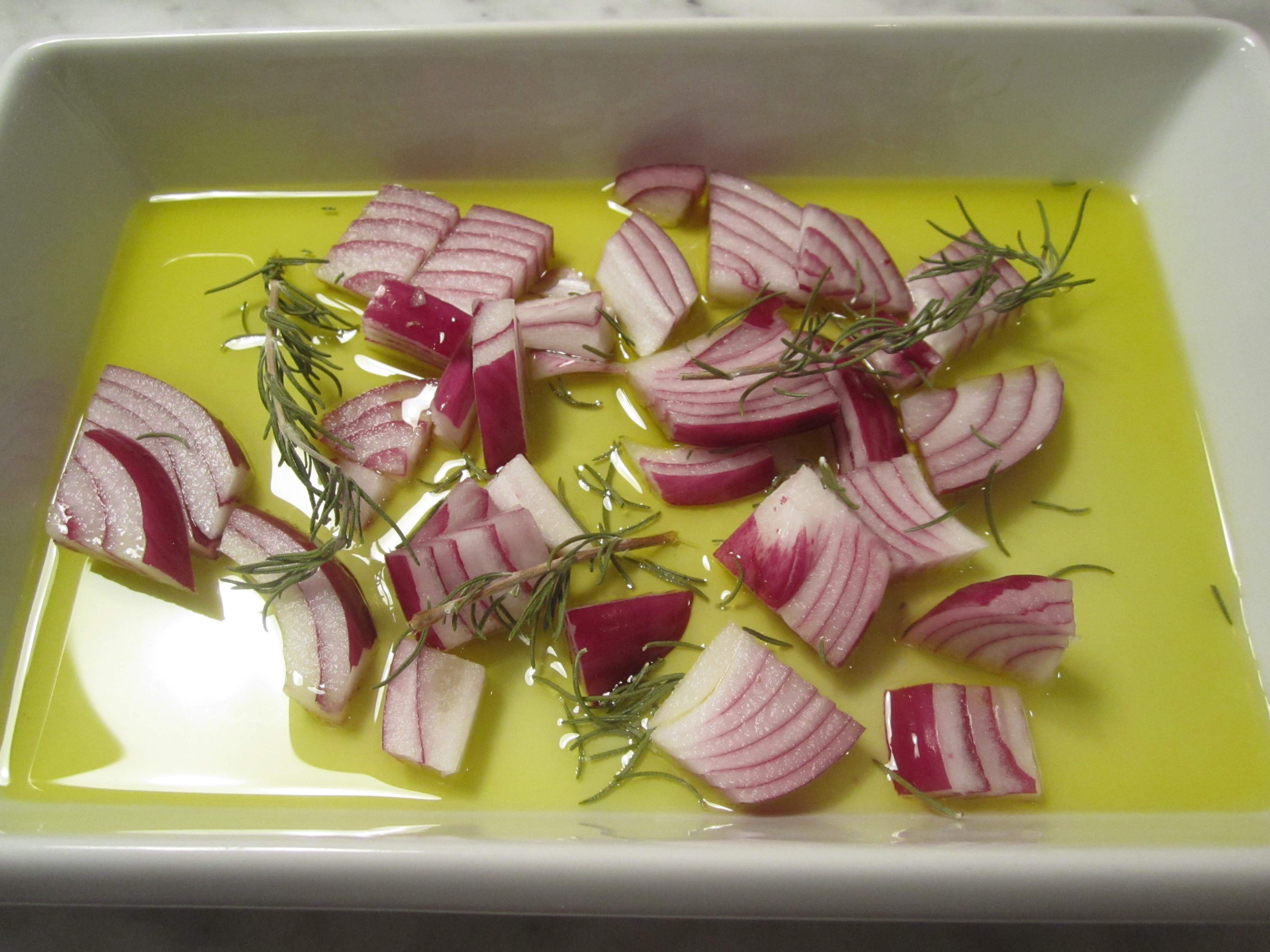 In a baking dish with low sides, scatter a coarsely diced onion, along with a couple of sprigs of rosemary in a quarter cup of olive oil.