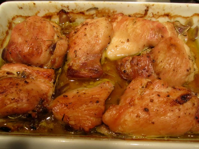 Broil at least 12″ from the heat source for about 40 minutes, turning every 10 minutes or so. Lower the oven to 350 and continue roasting for another 10 minutes or so or until all is golden around the edges. Use the oil and onions as a sauce.