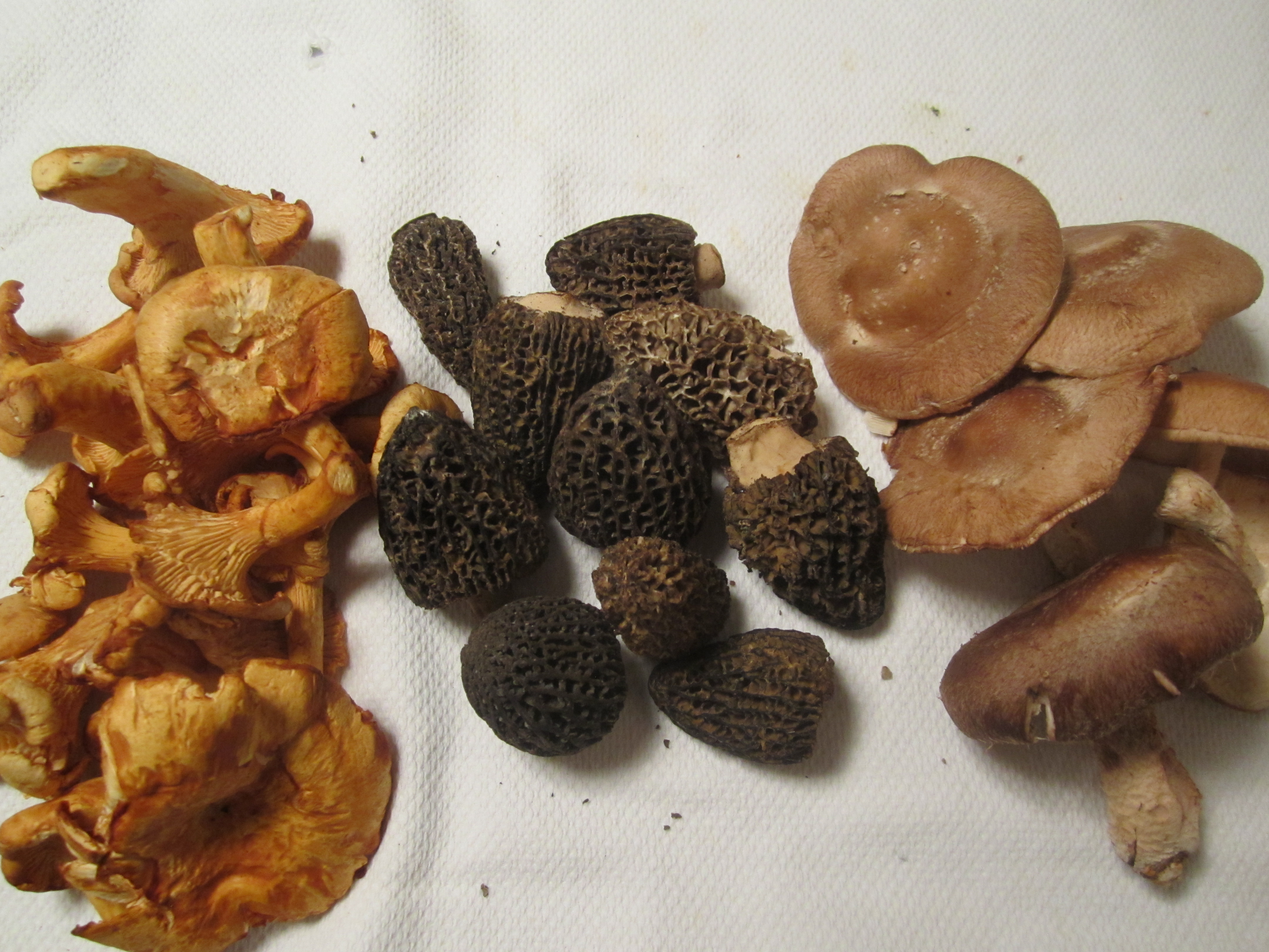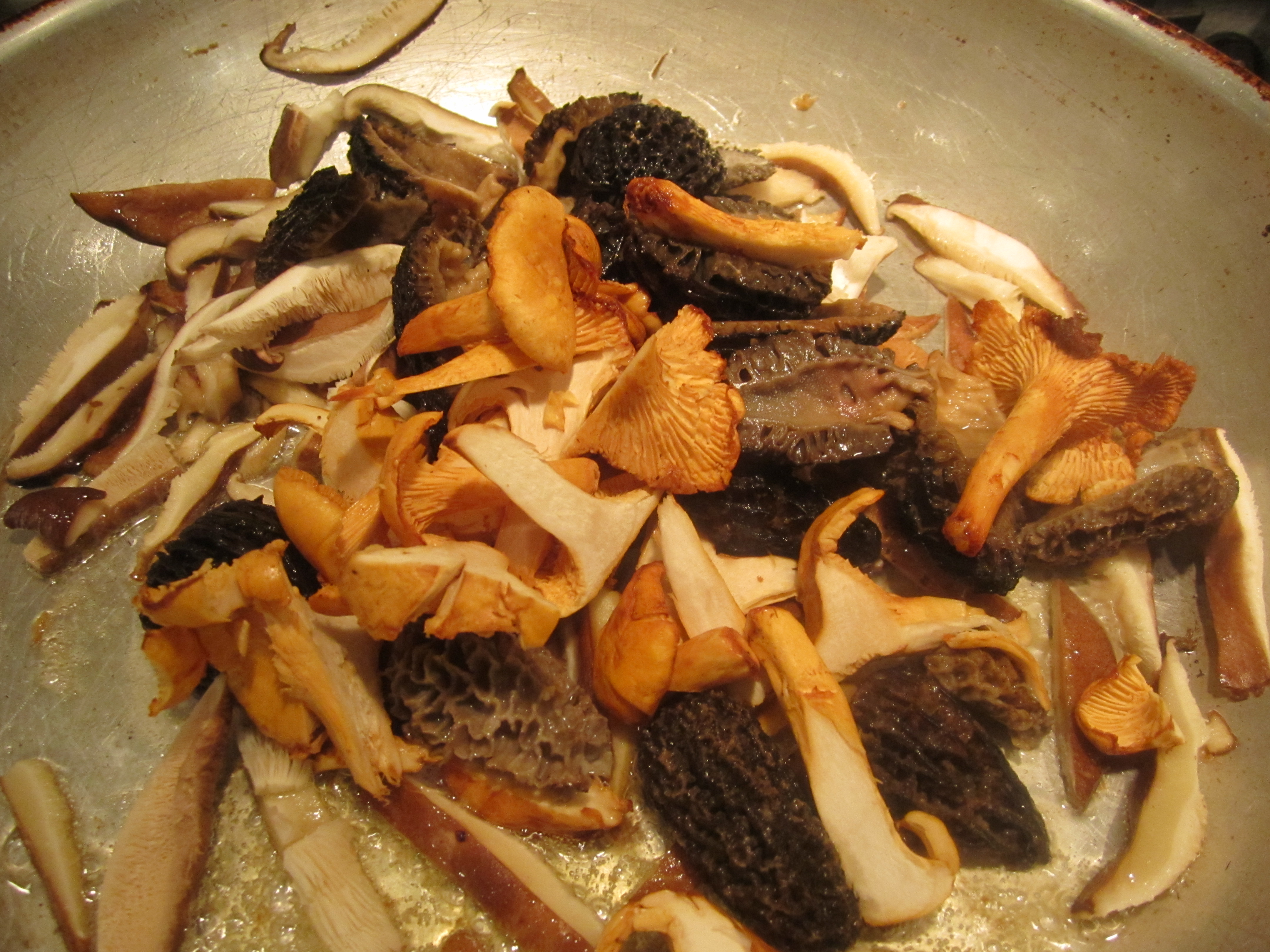 Tonight I’m making an intimate birthday dinner for two. For this special occasion, I’m seizing on the bounty of beautiful (and expensive) wild mushrooms that I’ve been coveting for weeks at my produce market. I’ve been noticing morels ($49/lb), chanterelles ($29/lb), and lobster mushrooms ($49/lb), as well as less rare varieties, like shiitakes and oysters. For the past couple of weeks, however, I’ve been cooking for larger groups, and not inclined to make such a lavish dish for a large group. Tonight, however, is the perfect occasion to buy a little assortment of these wild mushrooms, since I’m only cooking for two. I’ve selected chanterelles, morels and shiitakes (left to right, below).