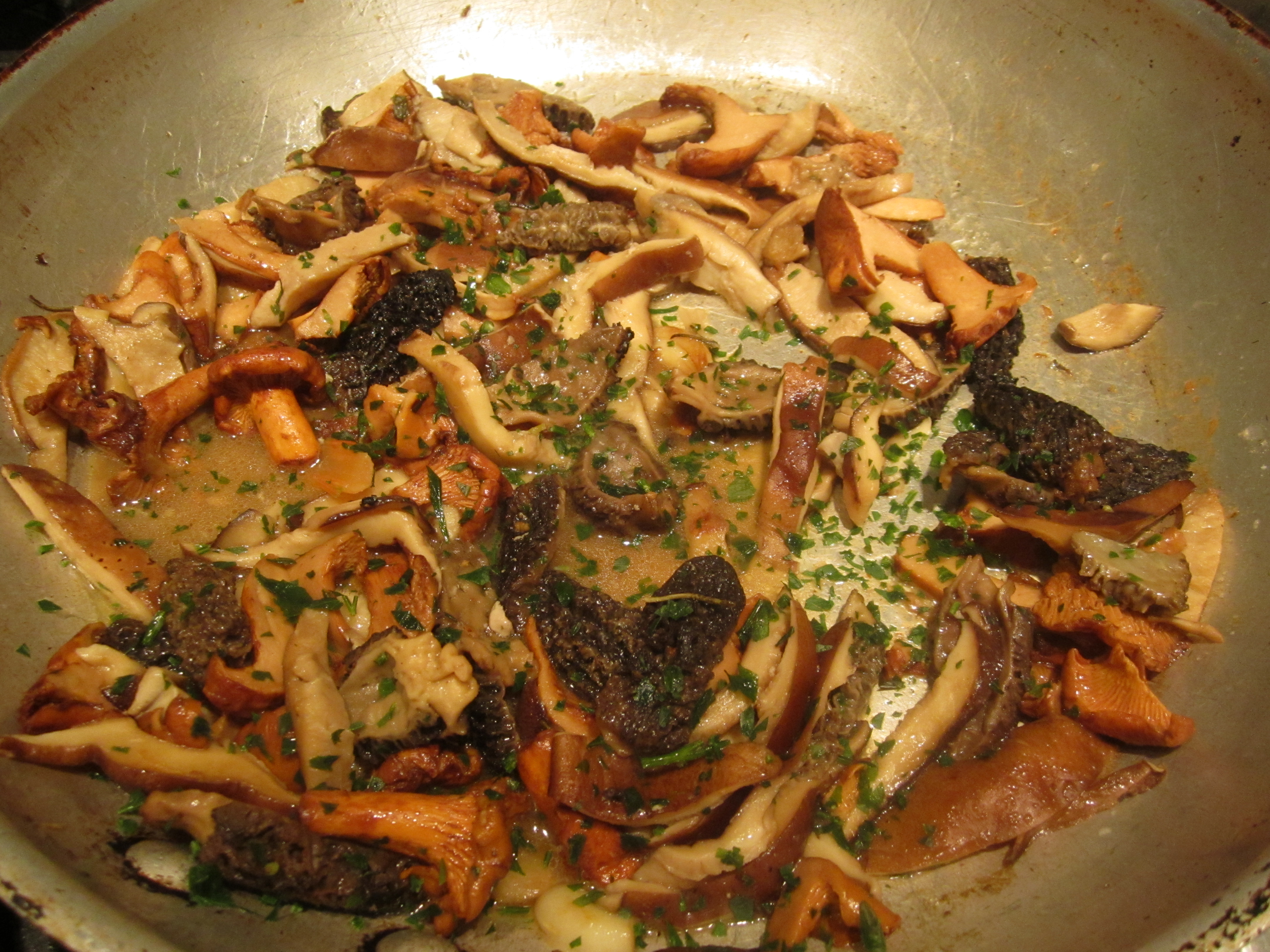 1 lb assorted wild mushrooms (I used 1/3 lb chanterelles, 1/3 lb shiitakes, 1/3 lb morels)