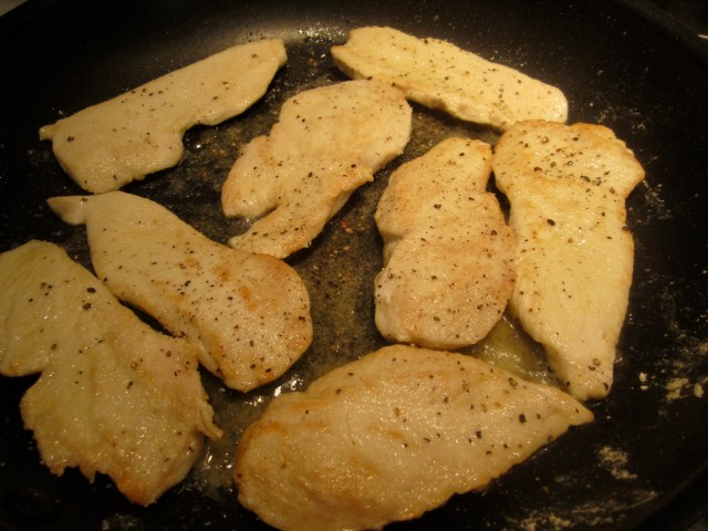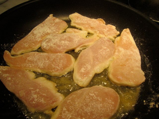 Place a broad skillet with 2 tablespoons of olive oil on high heat. Season cutlets well on both sides with salt and pepper. Dredge in flour, shaking off any excess. Gently lay cutlets in the hot oil and allow to turn lightly golden on one side. In this instance, crowding the skillet is fine–we’re not looking for a deep golden color–just a light browning.